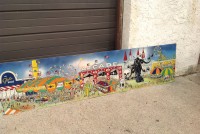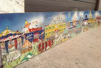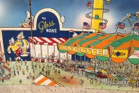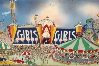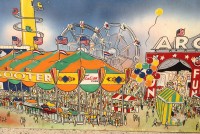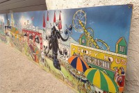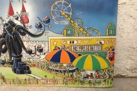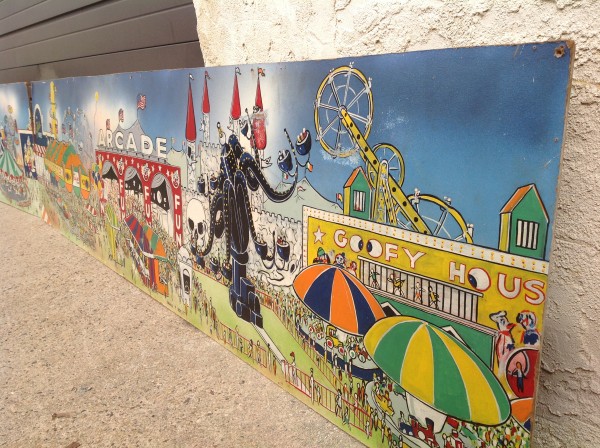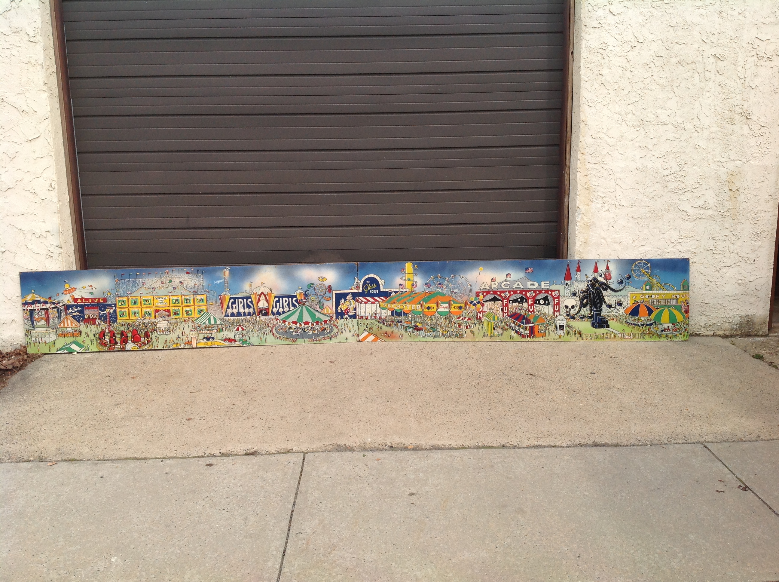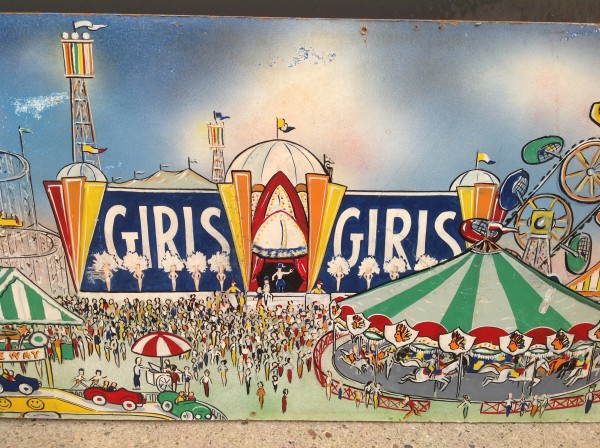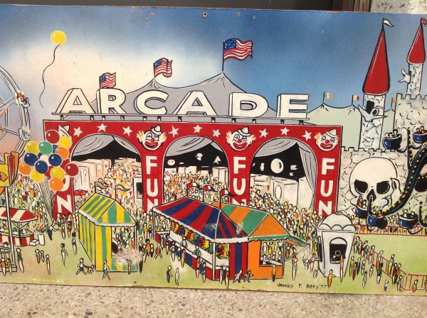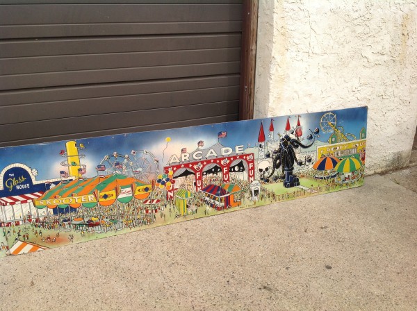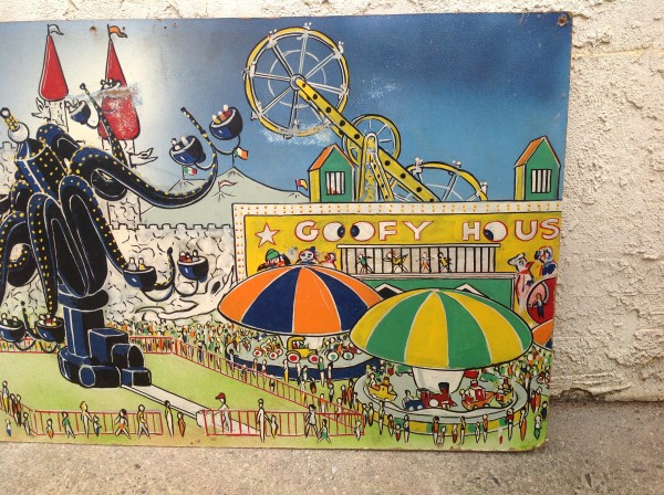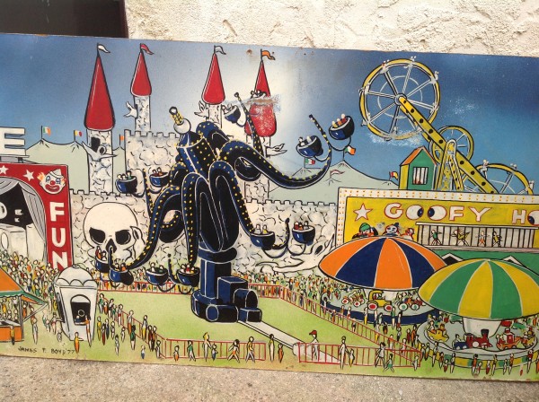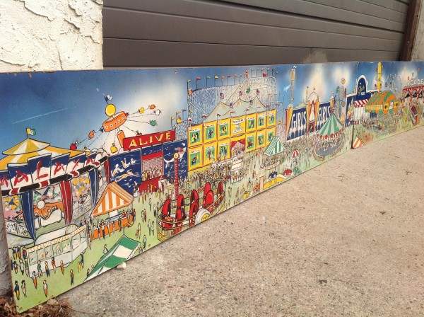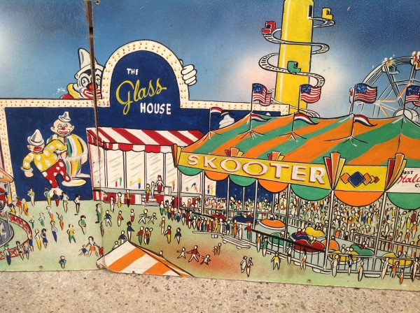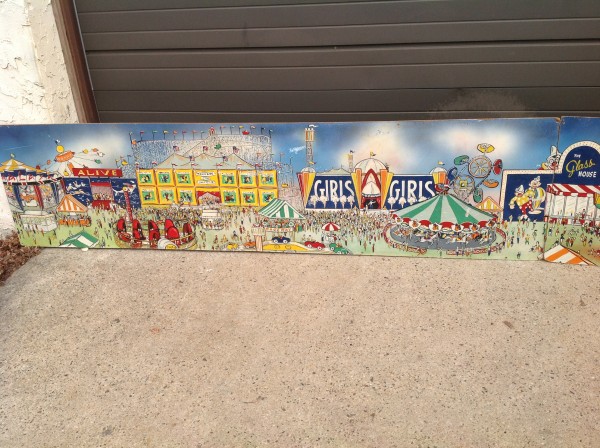 James F. Boyd back in 1977, a local painter from the Tampa Bay, Florida area. Painting measures 16′ long x 24″ high and captures the carnival midway from days gone by. As found condition with a few scratches but overall in very nice shape for displaying. One of a kind……