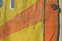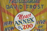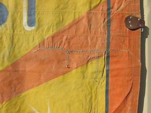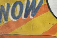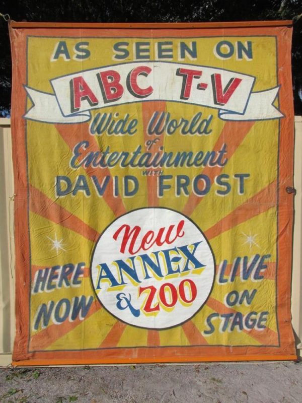 Huge old canvas circus banner “As Seen On ABC-TV” in as found condition measuring 9’7″ x 11’6″. Some in-painting with a few patches but overall a nice early example of carnival art. Nice colors…………..
