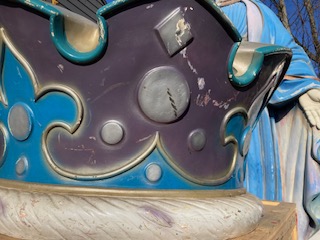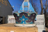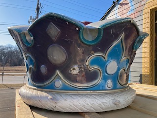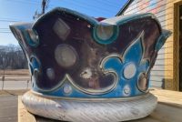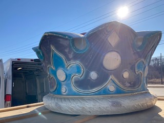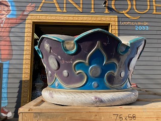 Huge fiberglass ride topper crown in as found condition. Crown measures 24″x 44″ needing some minor restoration. Great piece for a kids room, garden or back yard decoration. Guaranteed your neighbor will not have one………..