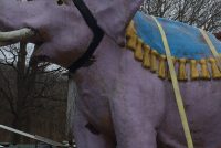 Amazing old miniature golf fiberglass Elephant measuring almost 18′ tall in as found condition. Needs some minor TLC but nice enough to display in your yard or business location. Unusual circus blanket design makes this Pachyderm a real beauty…………