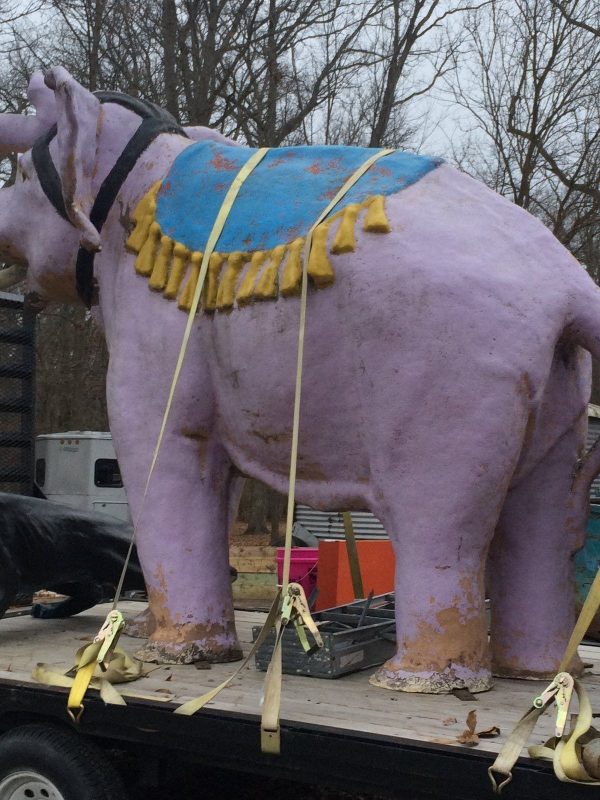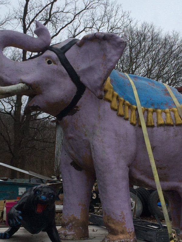 Amazing old miniature golf fiberglass Elephant measuring almost 18′ tall in as found condition. Needs some minor TLC but nice enough to display in your yard or business location. Unusual circus blanket design makes this Pachyderm a real beauty…………
