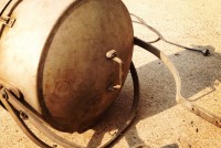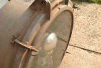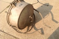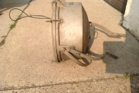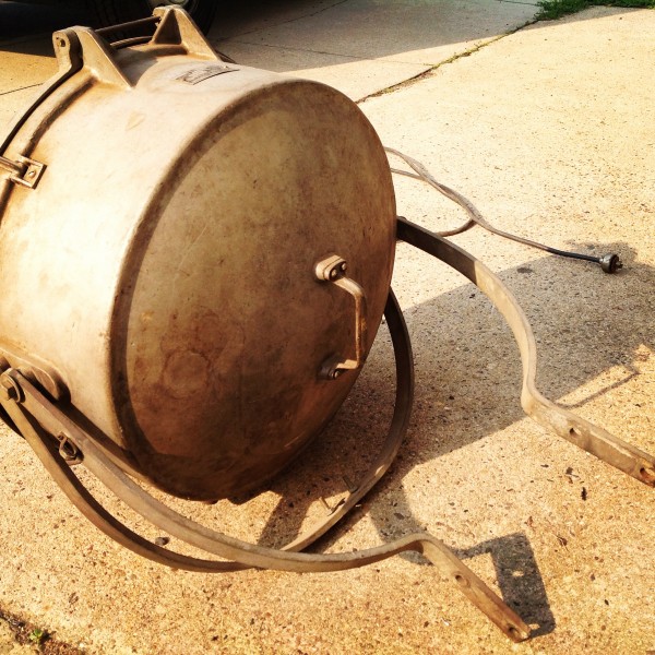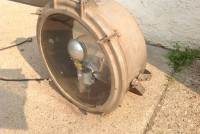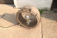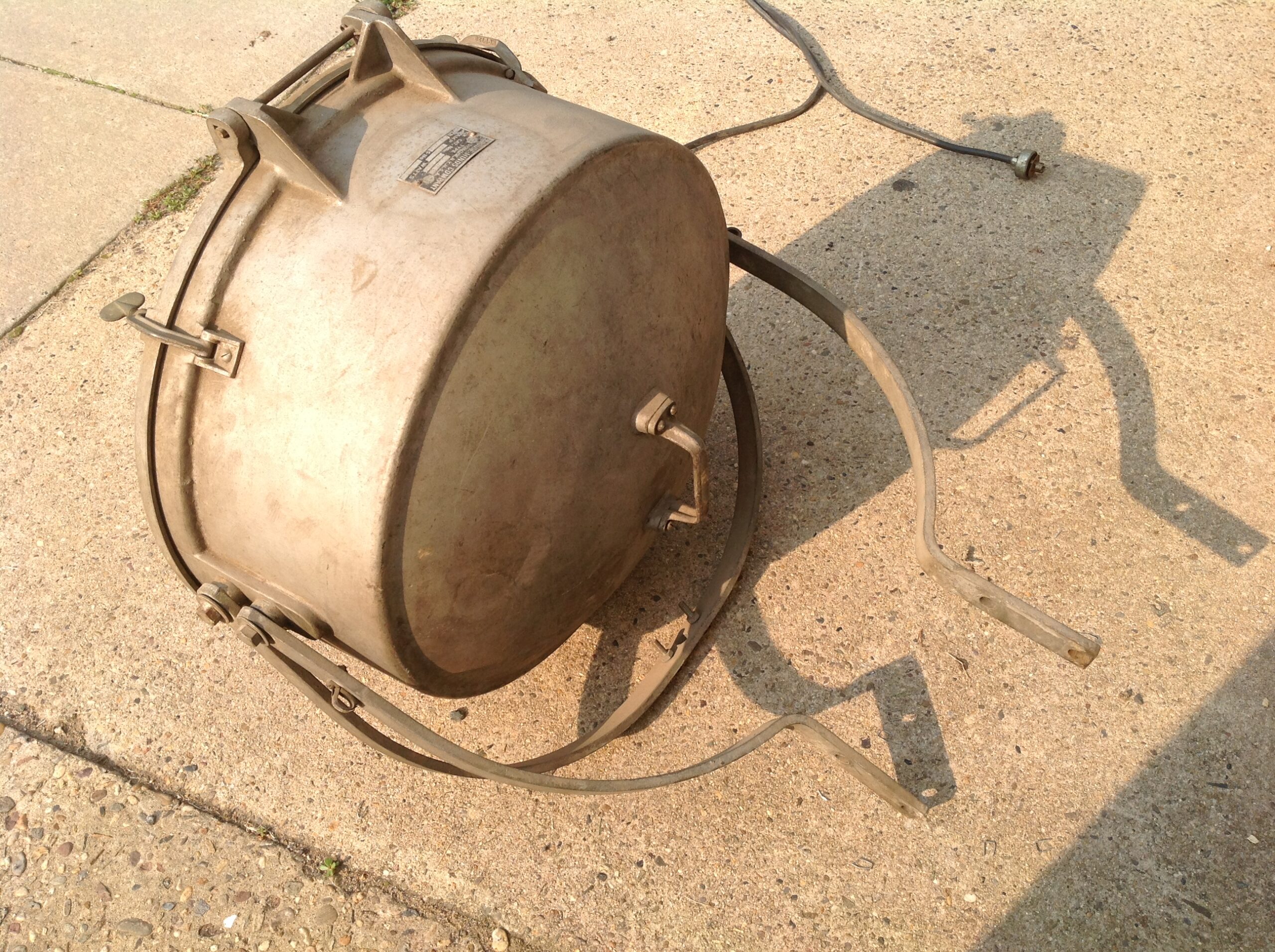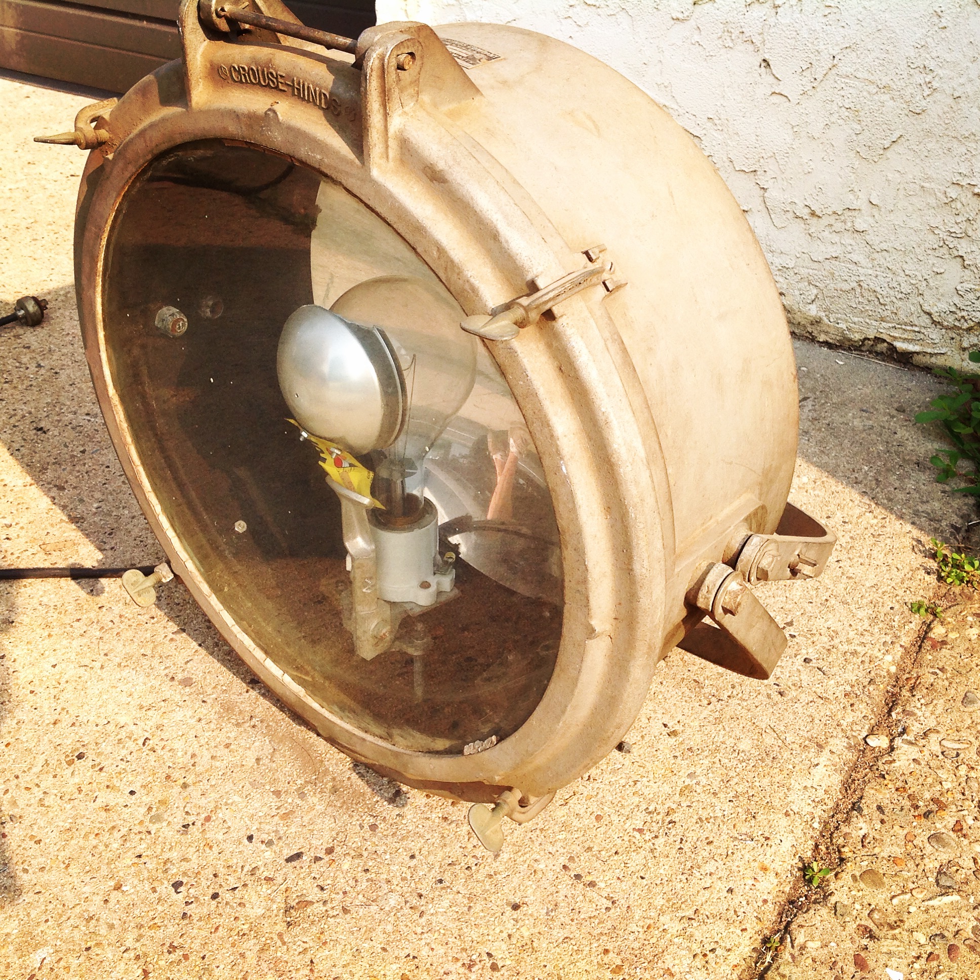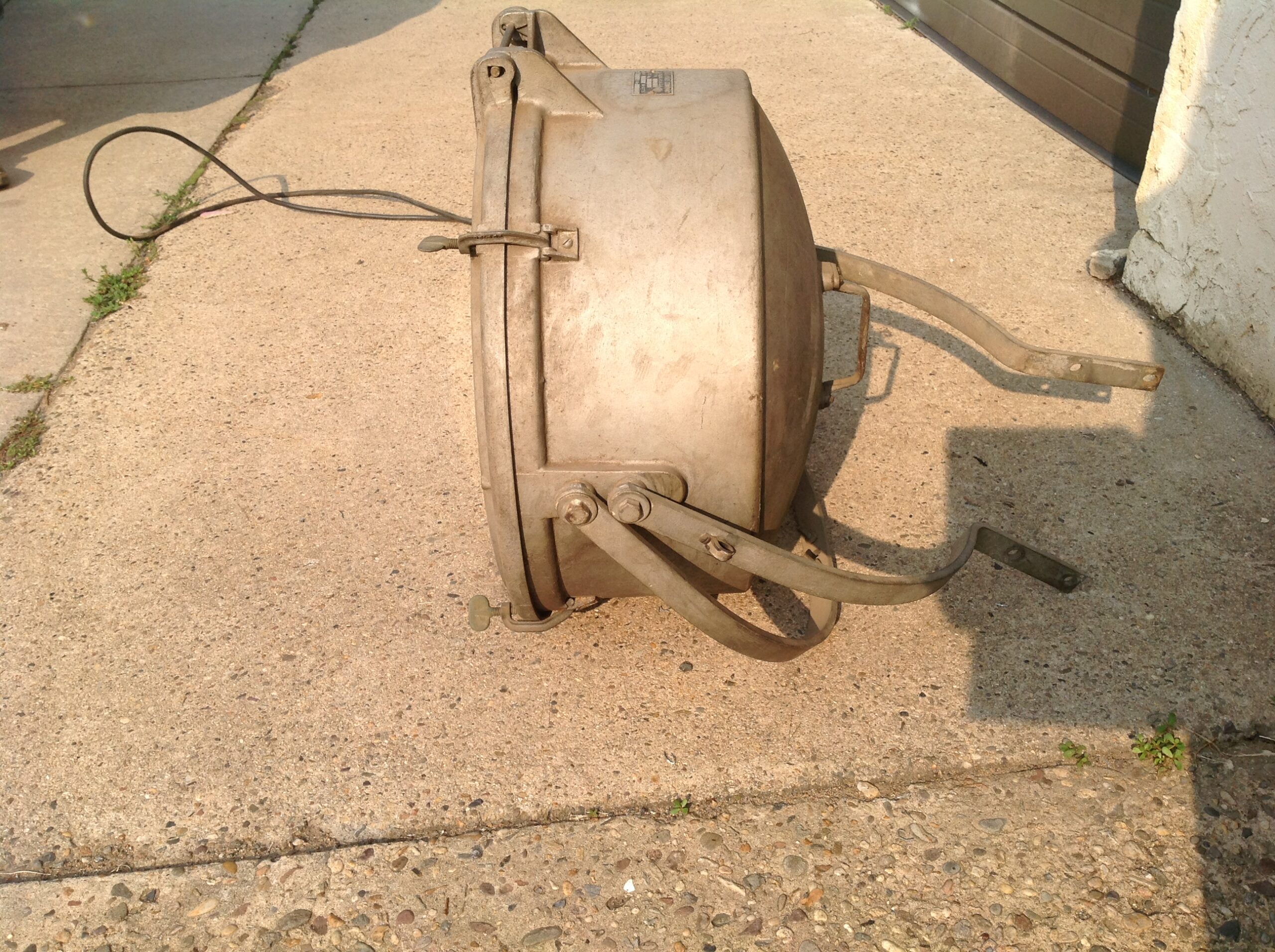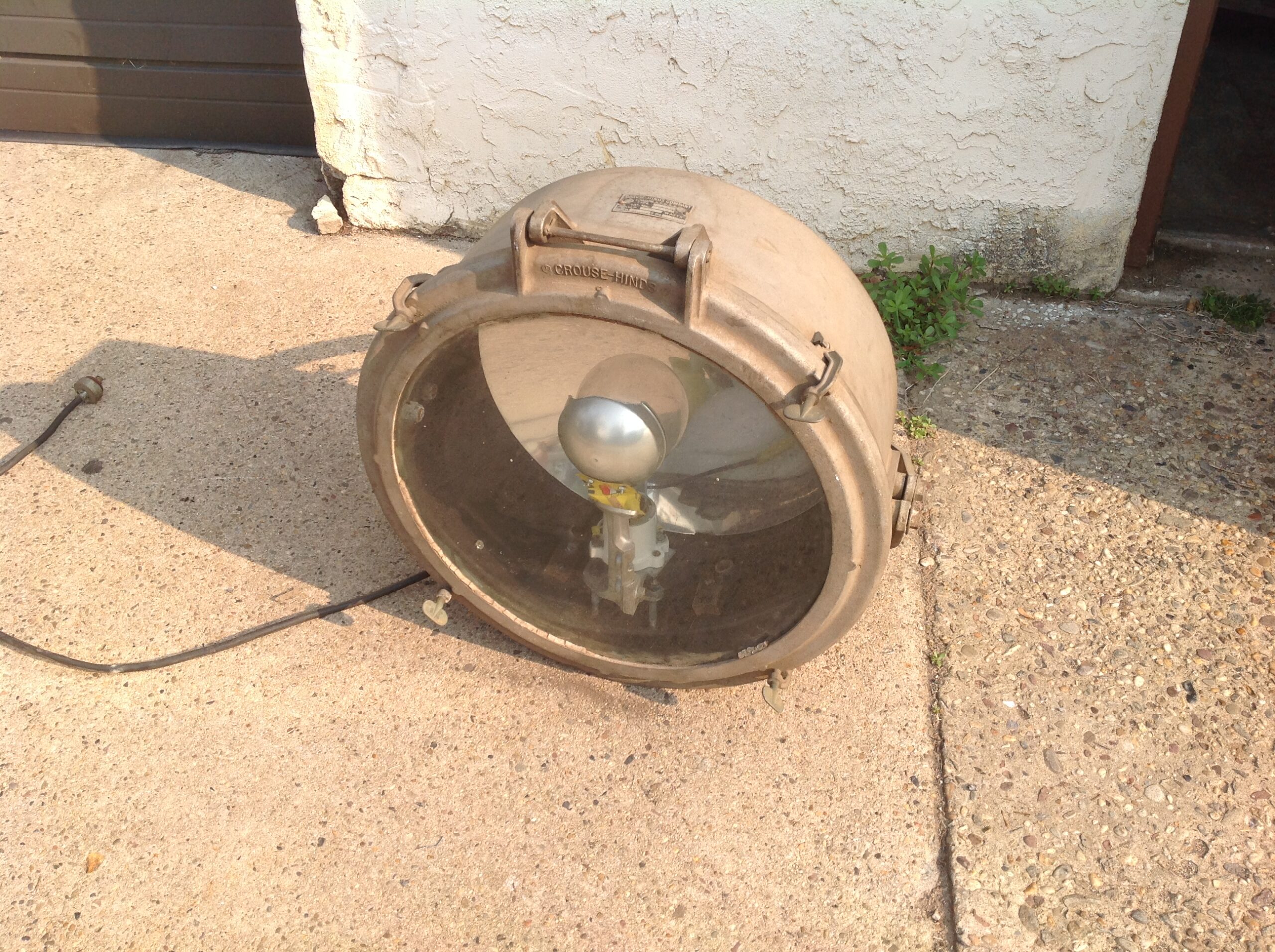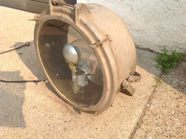 Huge vintage industrial Crouse-Hinds spot light in as found condition. Appears the silver round section and yellow piece below are not original. Will need a good cleaning………….