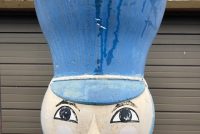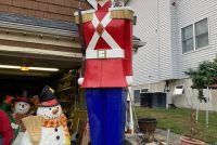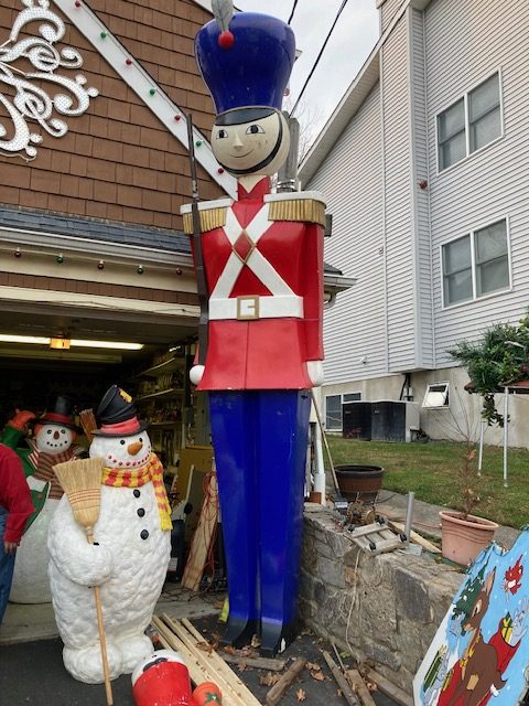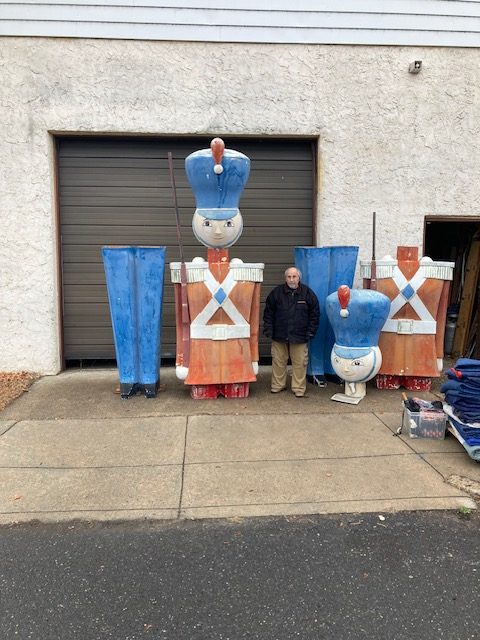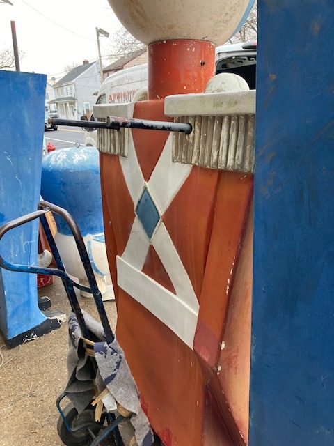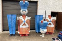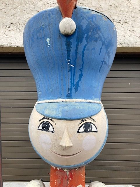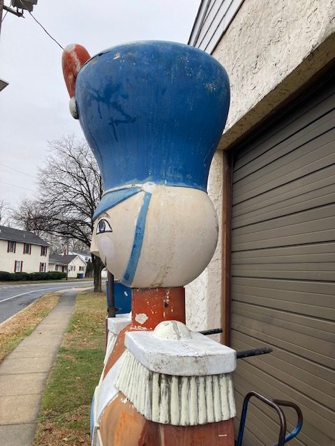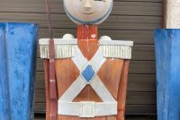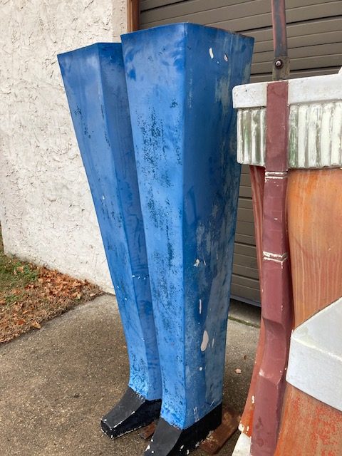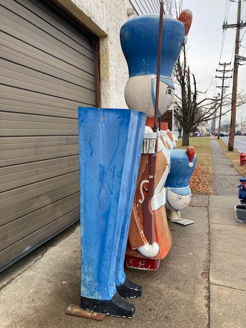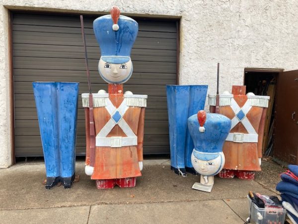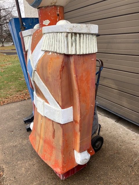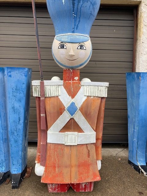 Massive huge vintage 1960’s Mid-Century Hess Department Store fiberglass Toy Soldiers in as found condition. Both Soldiers tower almost 17′ tall needing some minor restoration and painting. .12 were made for Hess, so where are the others? We can account for 5. Only one available. Last picture is a example of one restored and not for sale.
