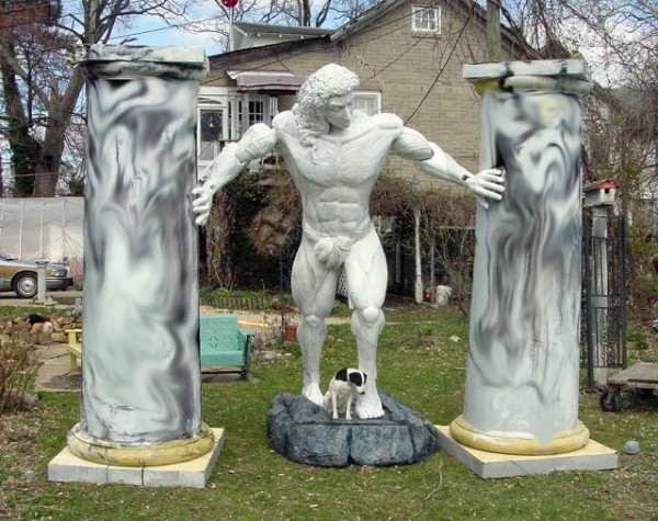 Large and outrageous, what else can be said. Samson is made of some type of resin material and measures over 9′ tall. Joined hands and arms. Columns and dog not included…………