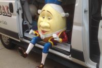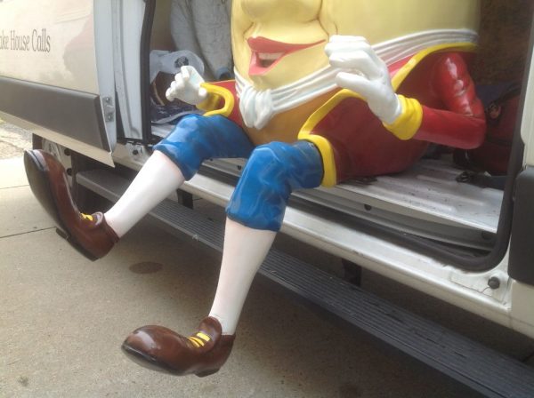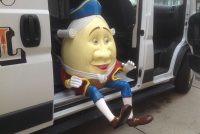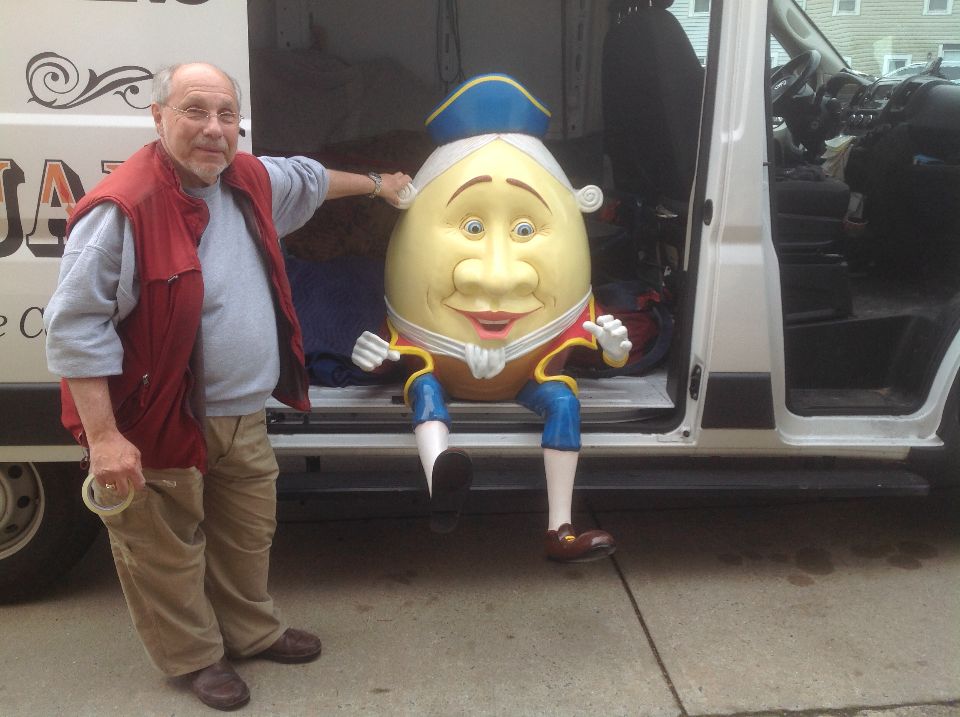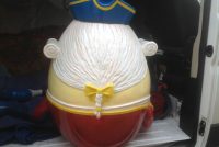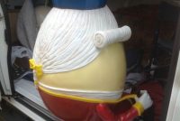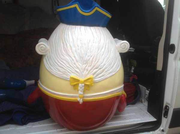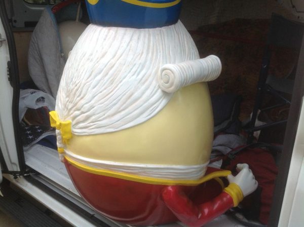 Magnificent fiberglass Humpty Dumpty display figure statue in as found condition. Humpty measures 57″ tall x 36″ wide x 33″deep. Happy guy needs a good home in some child’s room or school classroom. Make some kid happy………..
