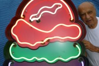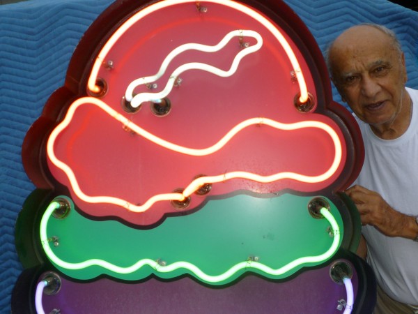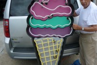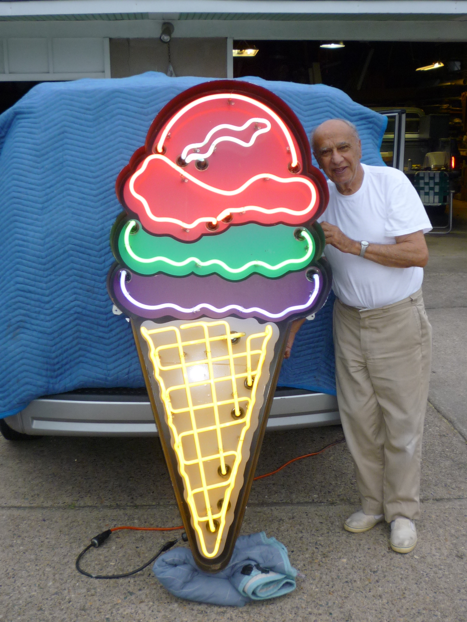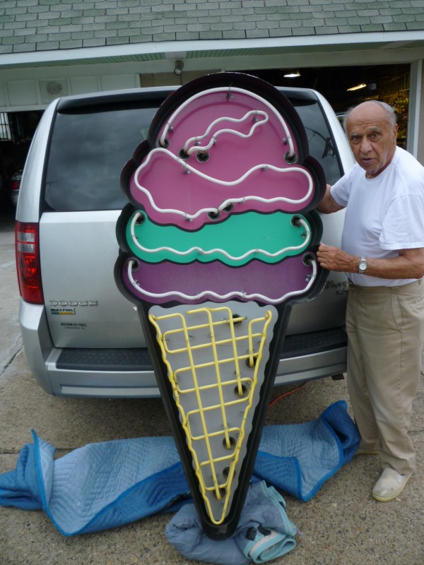 Nice 5 color ice cream parlor neon sign measuring approximately 5′ tall. Metal can and ready for hanging. Need an eye catching piece for that special room then this is for you………