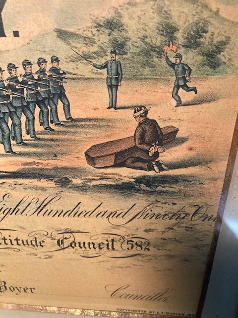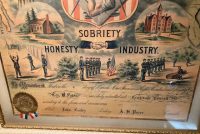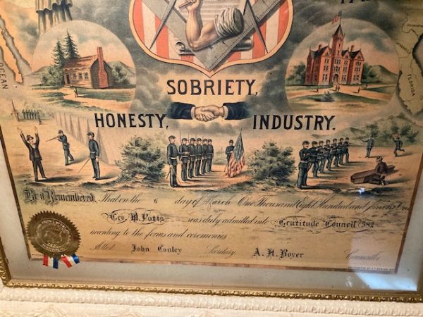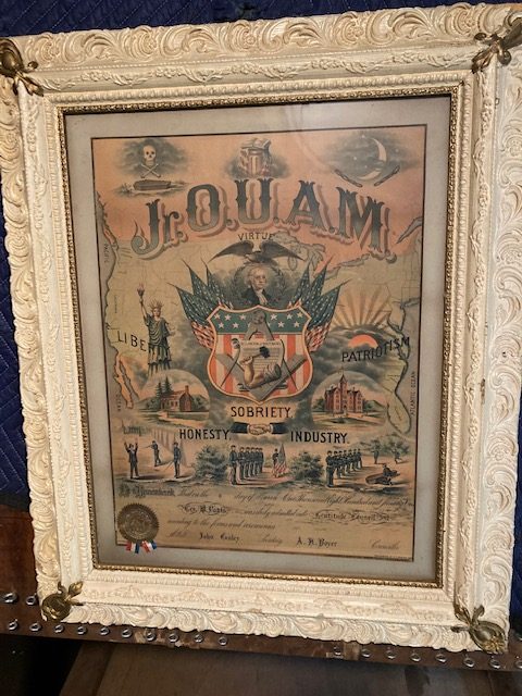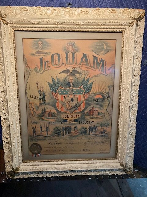 Framed JR. O.U.A.M. Fraternal Order Certificate seal dated 1891 Bridesburg, PA in as found condition. Overall in nice shape with decorative frame. Very collectible………