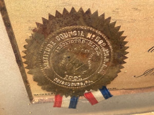 JR.O.U.A.M. Fraternal Order Certificate Seal Dated 1891 Bridesburg PA