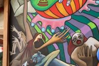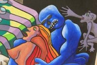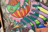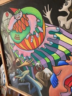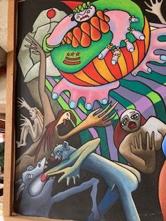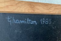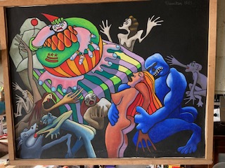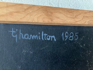 Large carnival style surrealism oil painting signed b Ti Hamilton dated 1985 in as found condition. Bright colors overall needing some attention to canvas paint loss and a new stretcher.Funky at best but catches the 80’s era as we all remember so well. Not sure when another will appear………..
