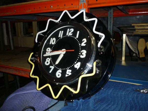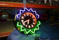 Large neon clock measuring about 30″ in diameter. Recently re tubed with todays new vibrant colors. This clock will light up any room………..
