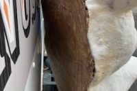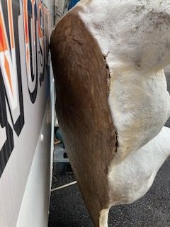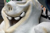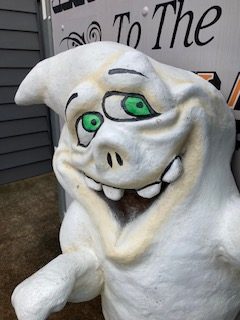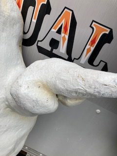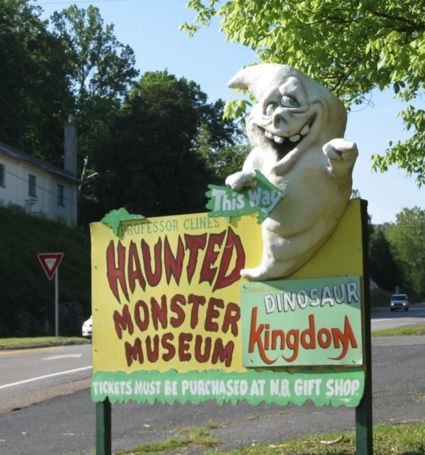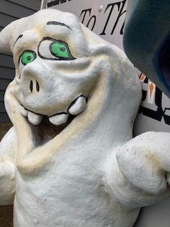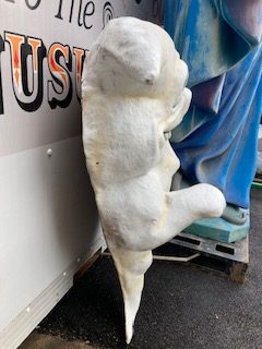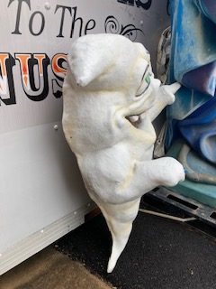One of a kind fiberglass ghost created by artist Marc Cline for the Haunted Monster Museum of Virginia. The museum burned to the ground in 2012 and almost nothing survived. Made with sturdy fiberglass construction, this ghost was used for the main billboard that directed guests to the attraction. Measures 5 feet tall, 3.5 feet wide and sticks out about 18”. Will be great for any fiberglass or monster collection, and you’ll never see another….