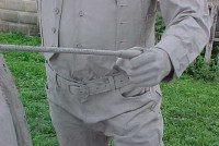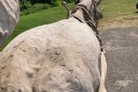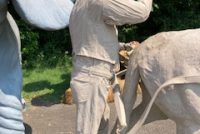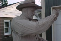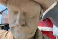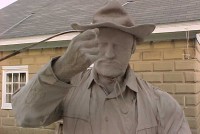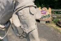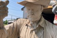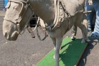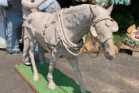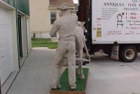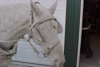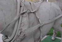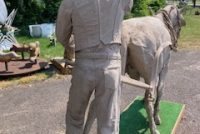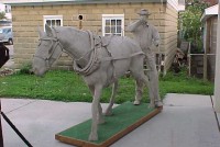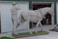 Wow!!! What a neat piece of art. Life size horse and drover made as a window display for the Strauss Company.Only 9 were made for the company. Papier (paper) mache, fiberglass and wire construction with a gray/brown sprayed on surface. The drover is wearing a authentic Levi outfit and the harness and strapping are real. Shows minor signs of wear but nothing that distracts from the rarity of this display.