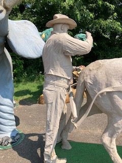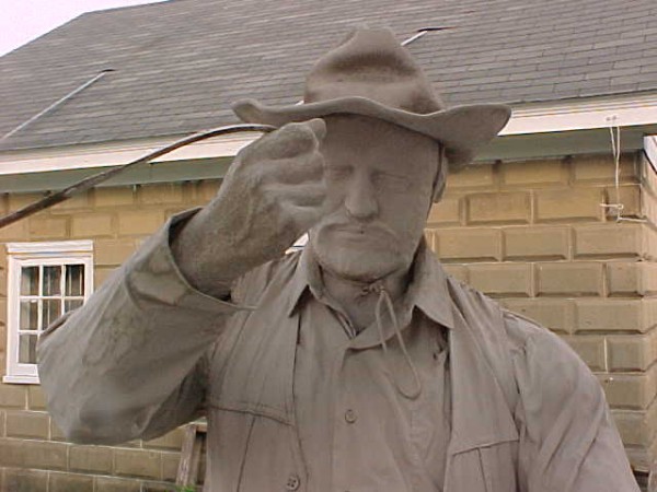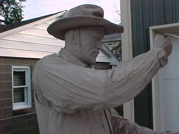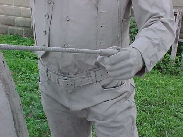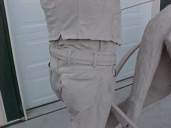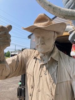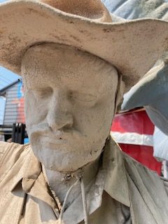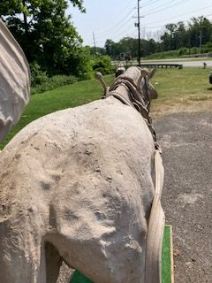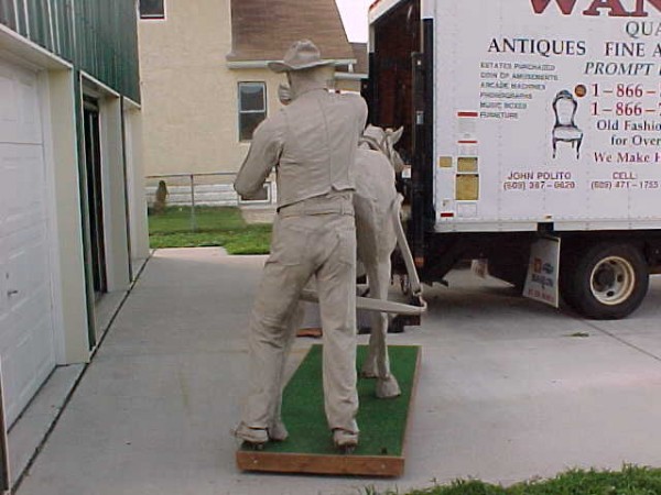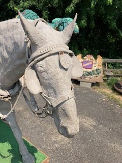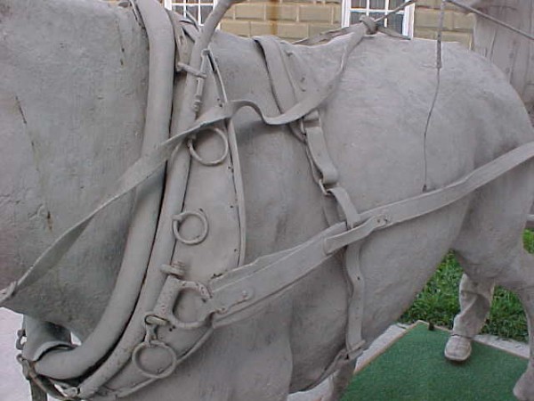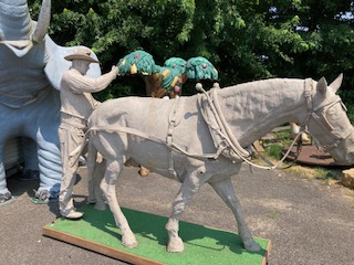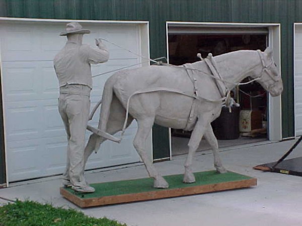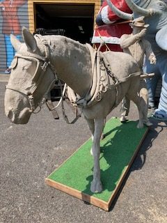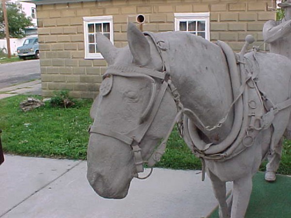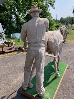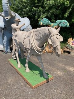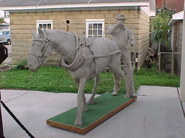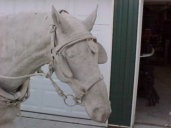 Wow!!! What a neat piece of art. Life size horse and drover made as a window display for the Strauss Company.Only 9 were made for the company. Papier (paper) mache, fiberglass and wire construction with a gray/brown sprayed on surface. The drover is wearing a authentic Levi outfit and the harness and strapping are real. Shows minor signs of wear but nothing that distracts from the rarity of this display.