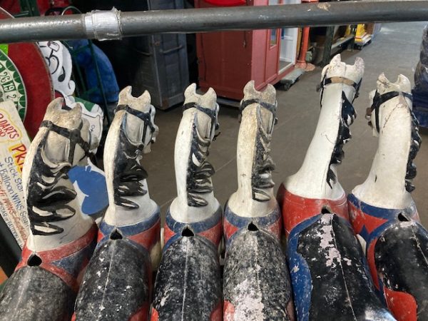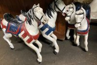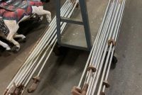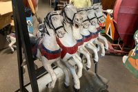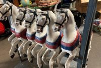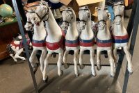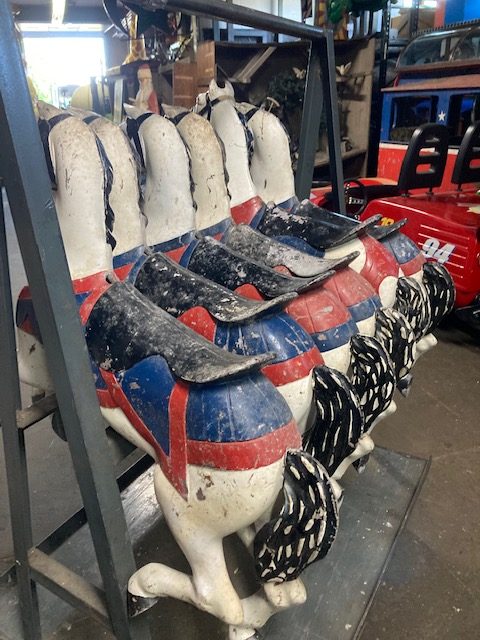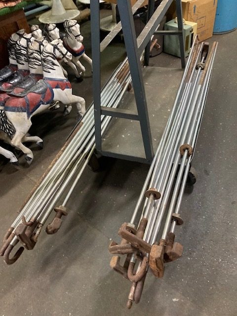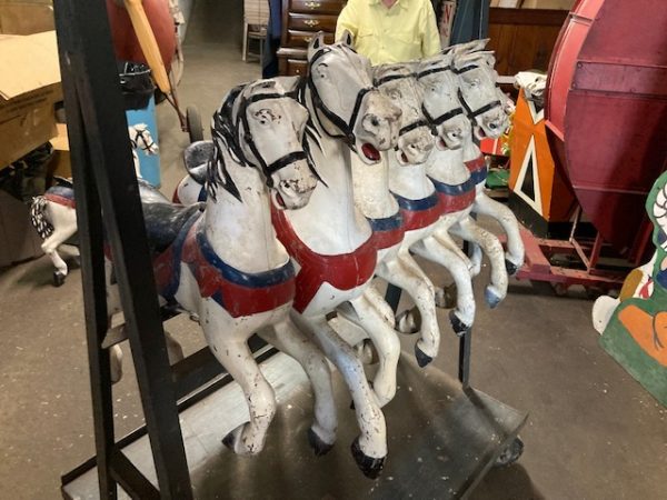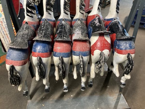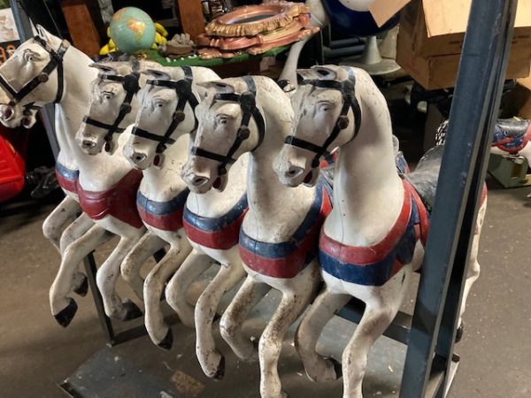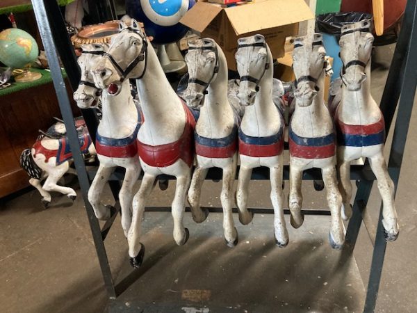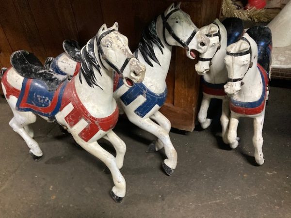 Group of vintage metal Mangels carousel horses in as found condition with poles. Just found after being in storage almost 30 years. Nice condition with good patina. Sold by the piece. As of now 10 are available…………