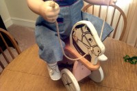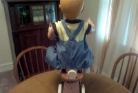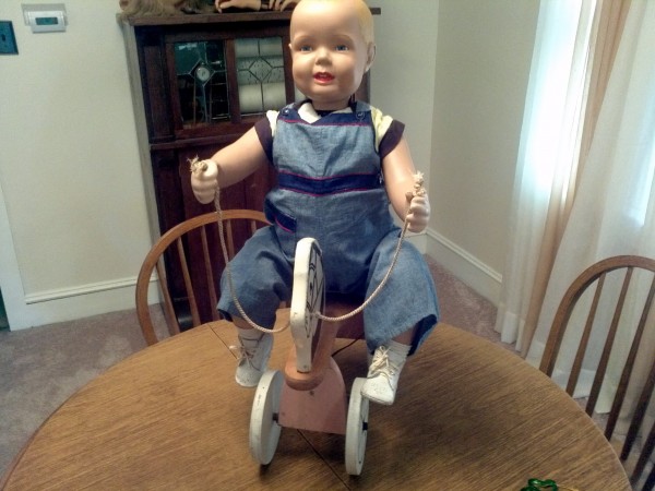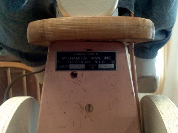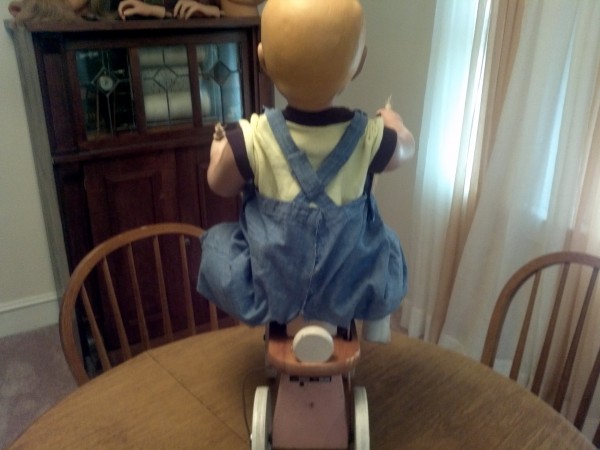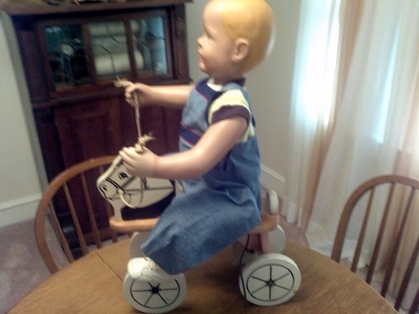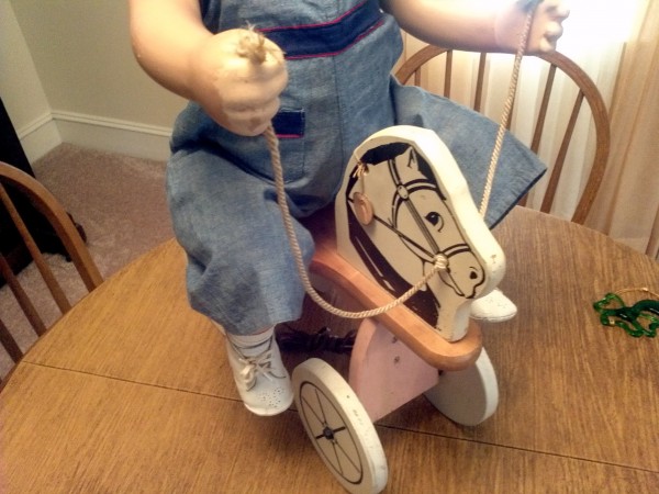 Wonderful old vintage Boy on Bike animated window display in working condition. Little guy turns his head as his feet and hands moveĀ as the wooden horse moves back and forth. Left hand has been touched up but otherwise in excellent condition. Dessed in an appropriate outfit for his age. Ready for displaying……….