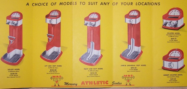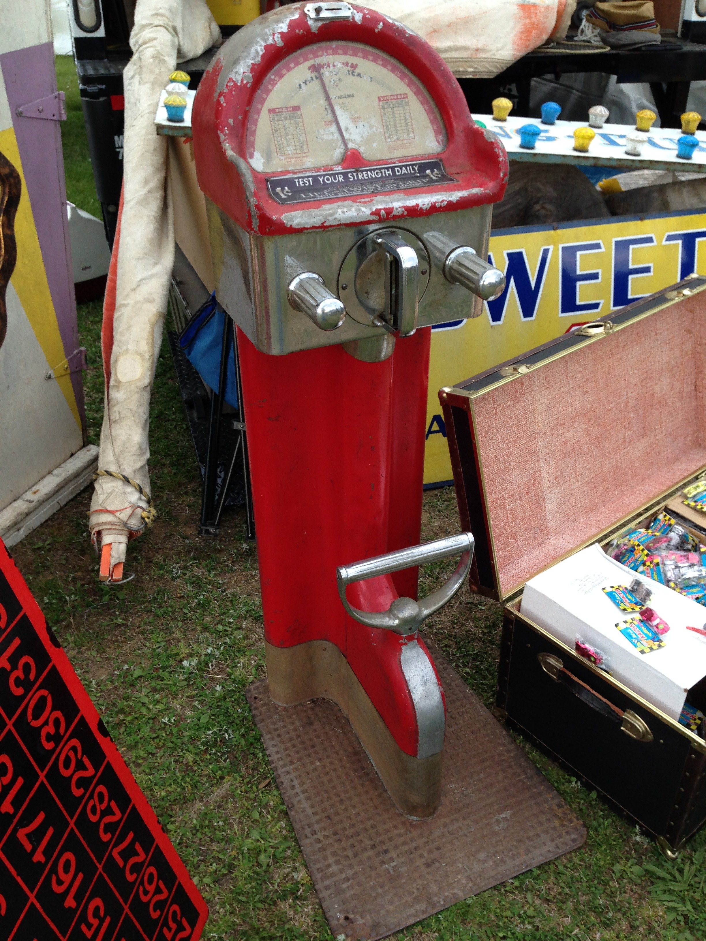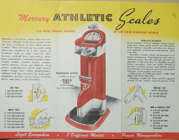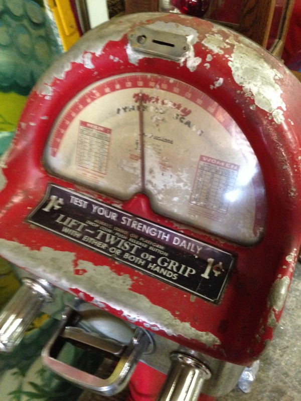 Mercury penny arcade strength tester in as found condition. Looks to be complete but not working. No keys. Strength machine needle does not reset, should be an easy fix. Better than exercising…………