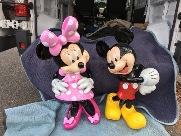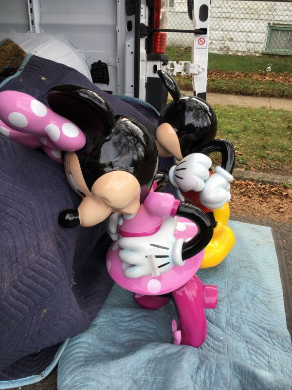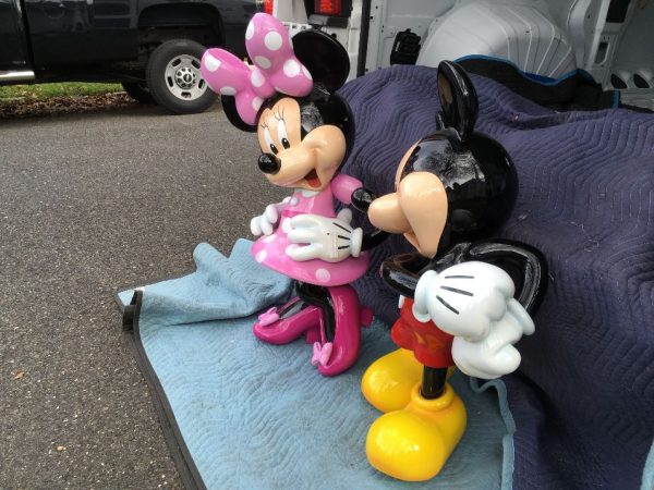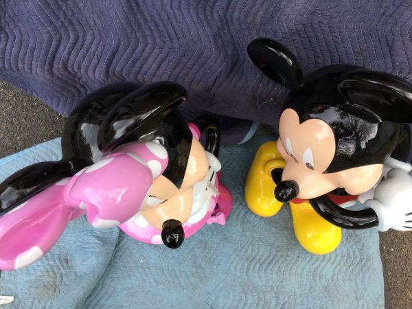 Mickey and Minnie Mouse store display figures in as found condition. Mickey measures 39″ tall and Minnie 42″. Both figures are high quality, made of fiberglass resin lasting for years. New owners may want to put on bases as they are not included. Sold by the pair or separately …………..