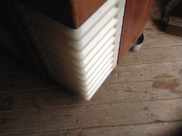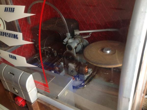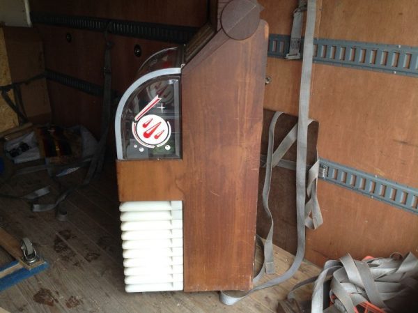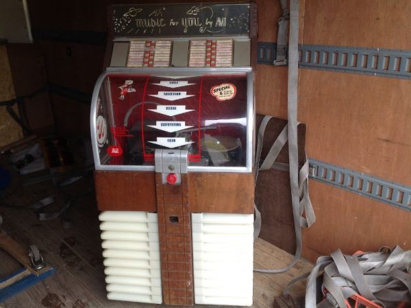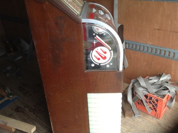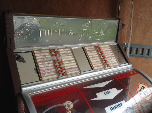 Mid-century AMI D 40 coin operated jukebox in as found condition. Motor runs but will need servicing to function correctly. Looks to be original with a slight crack on top plastic marquee and lower corner left of bottom arrow near coin entry mech. Neat old antique box……….