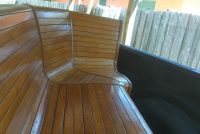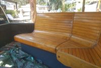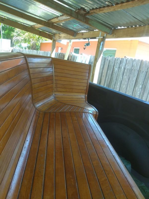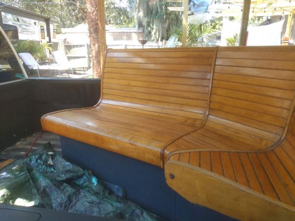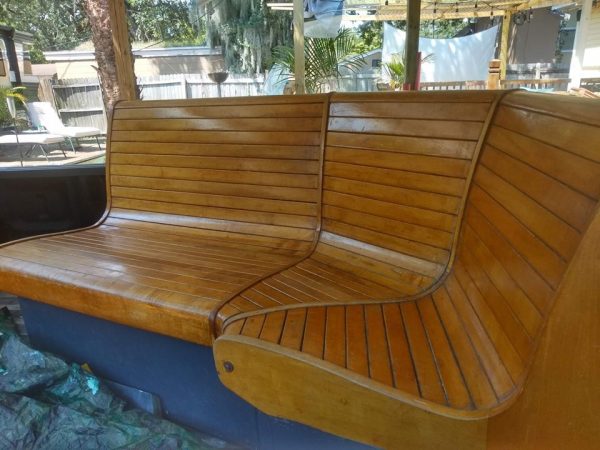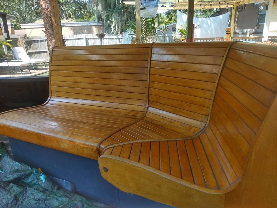 Mid century corner bowling alley bench in well used as found condition. Could use some refinishing if you choose. Located at our storage warehouse in Tampa Florida. Ask questions if interested…………….