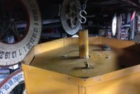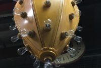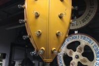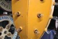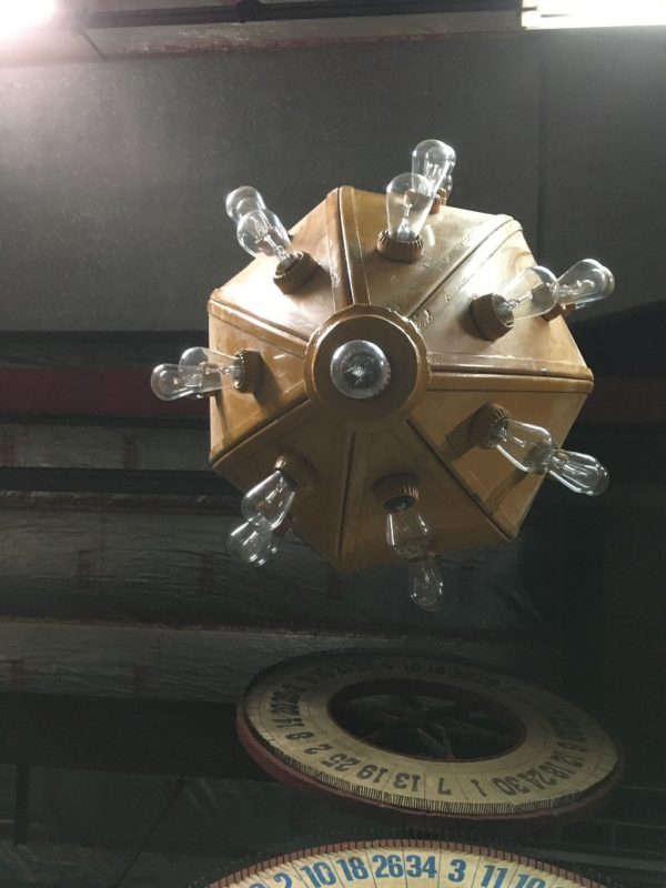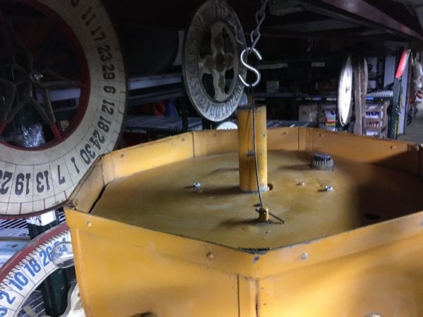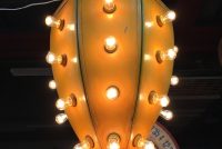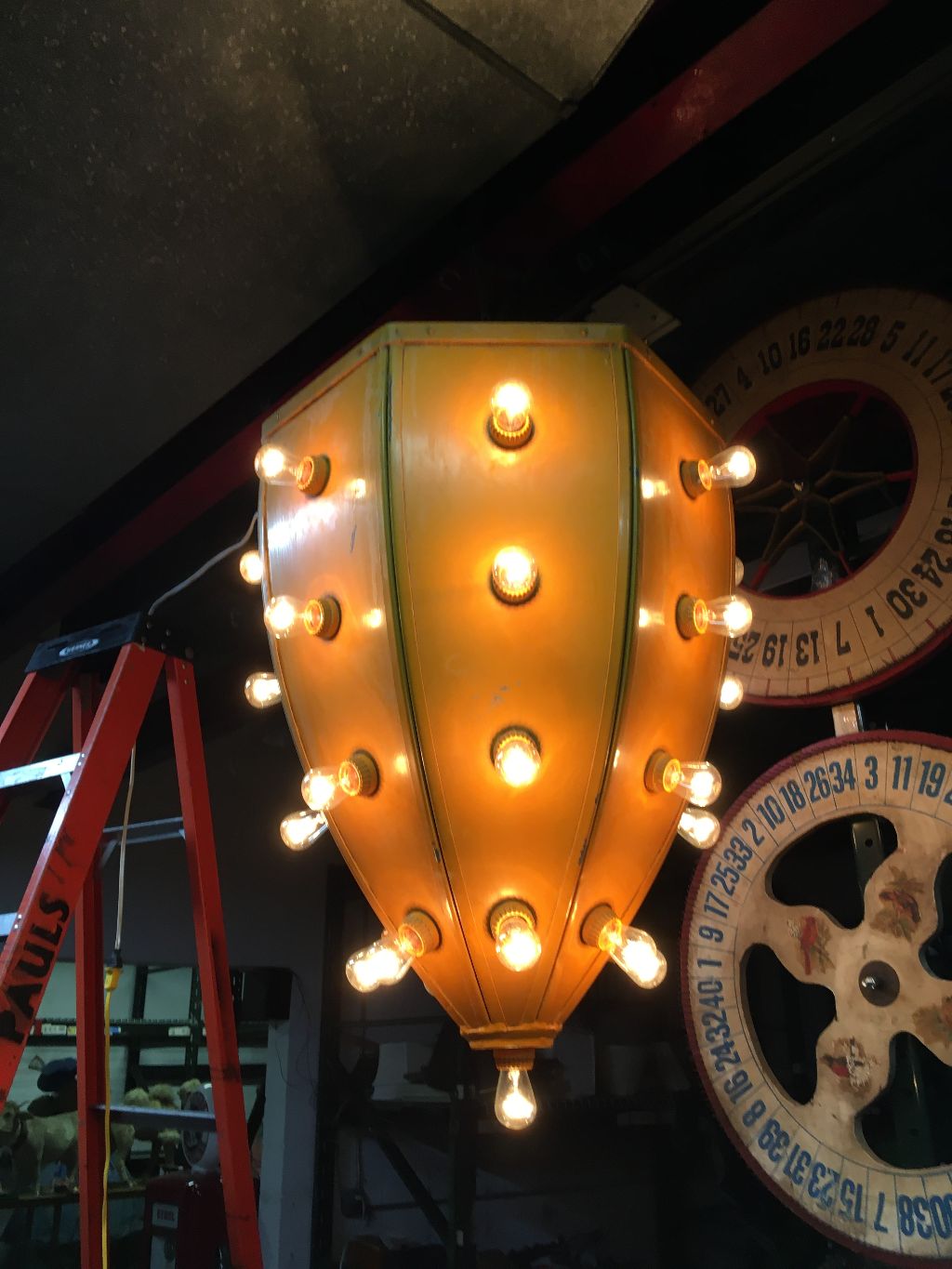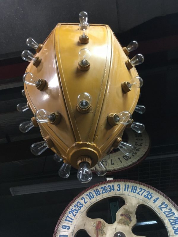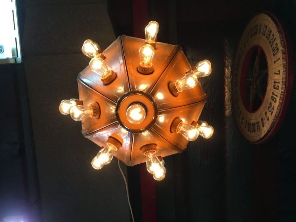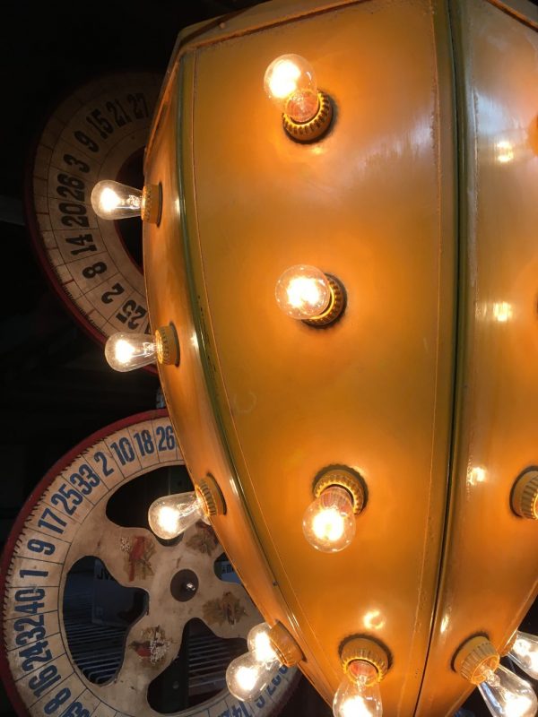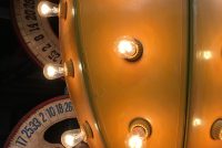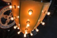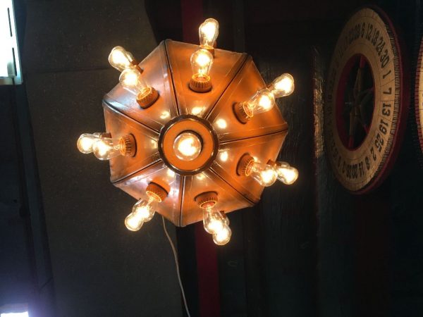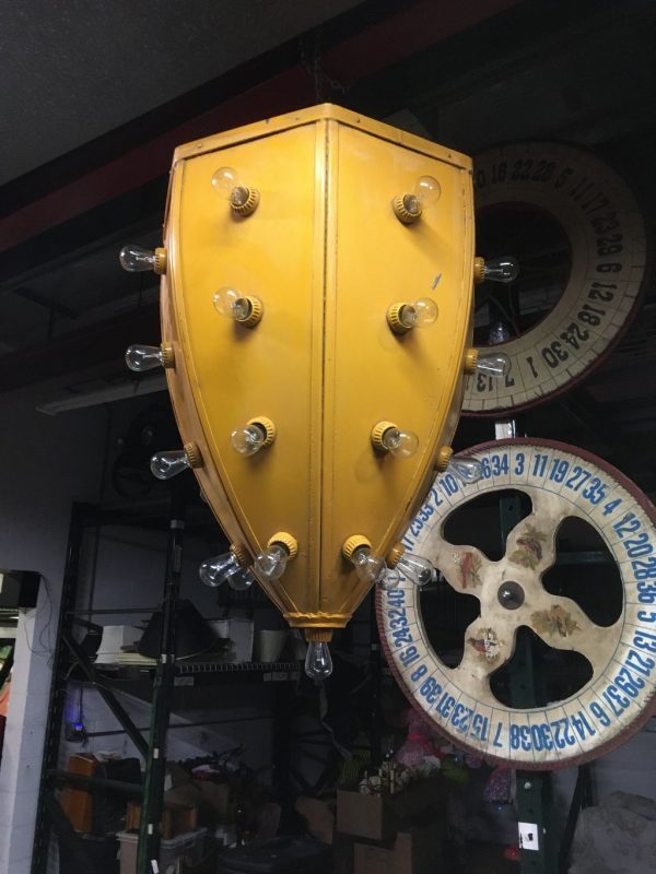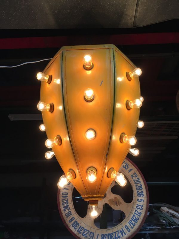 Vintage mid-century metal carnival ride multi bulb light measuring 32″ x 22″ in as found working condition. All new marquee bulbs included. Great light for any game room theme……