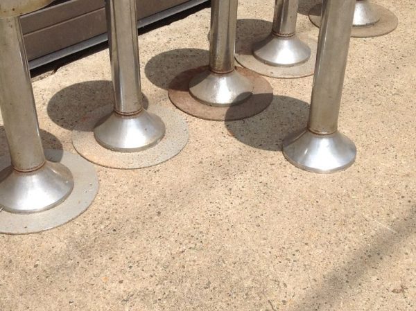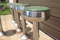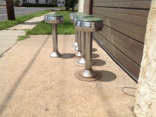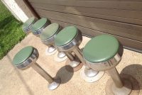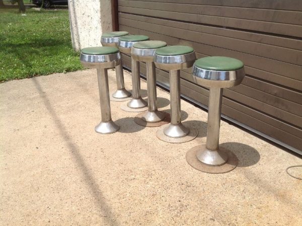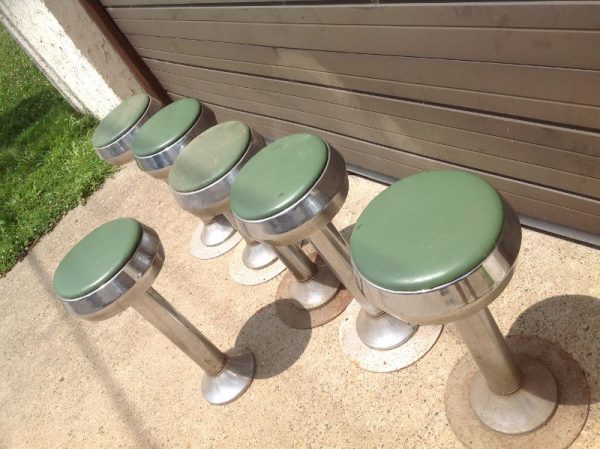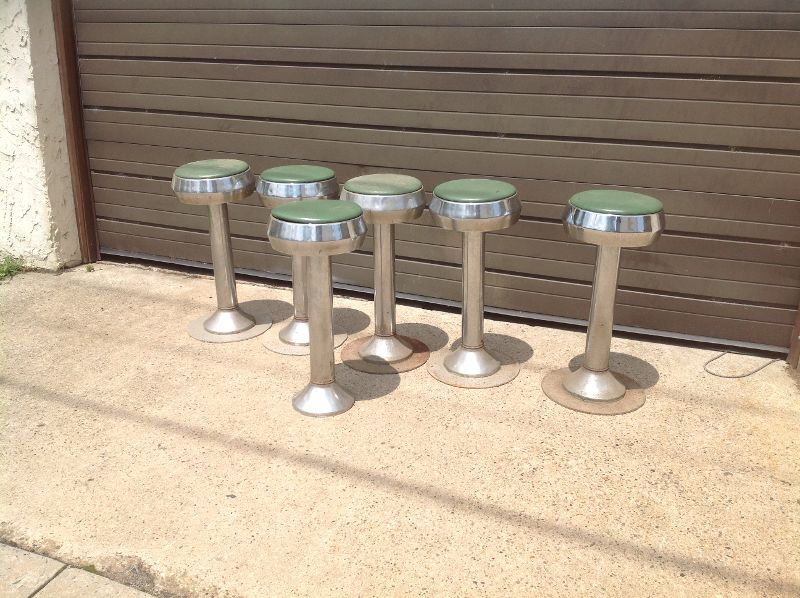 Set of 6 mid-century diner stools in as found condition. Some nicks and dings but overall in fair to good condition needing a good polishing. Priced to go………………