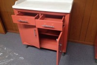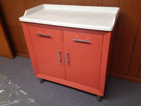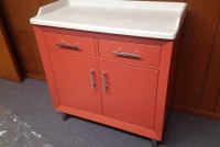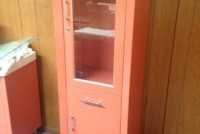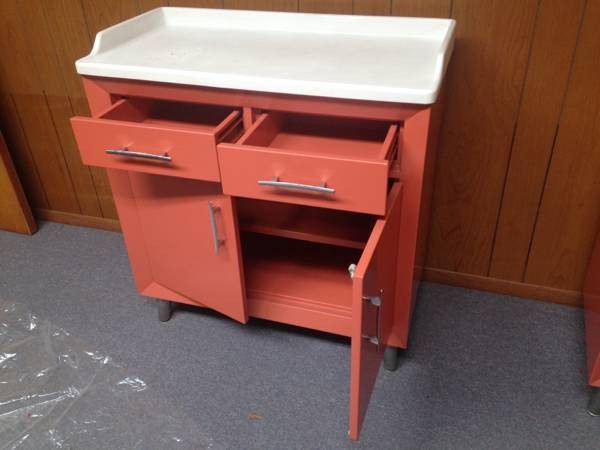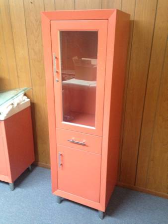 Wonderful old 1950’s mid cnetury Doctor’s office cabinets and trash can in near perfect condition. Flamingo pink with chrome door hamdles. Come complete with key. Hard to find in this condiiton anywhere. Must be sold as a complete set………….