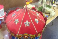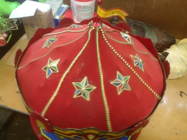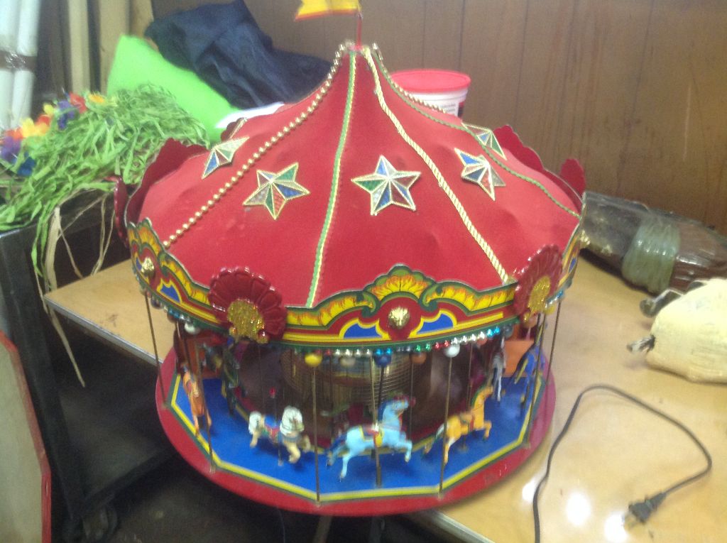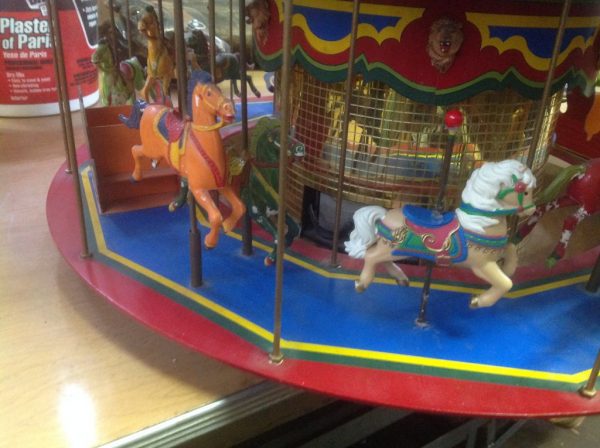 Nice vintage 1970’s working miniature carousel window display by Suba Display in as found condition. Measures 24″ diameter x 24″ tall. Complete with continuous loop cassette player with recorded Carousel music. Carousel shows some minor wear on carousel top but overall a very nice example……….