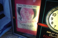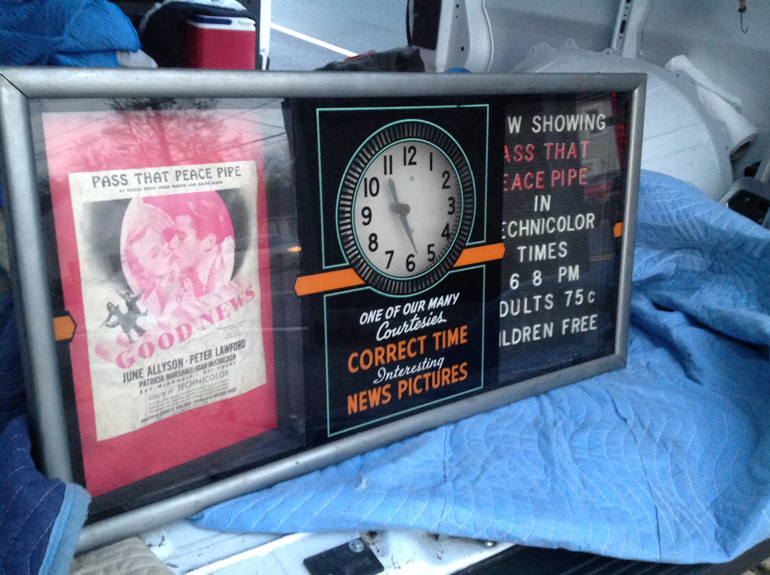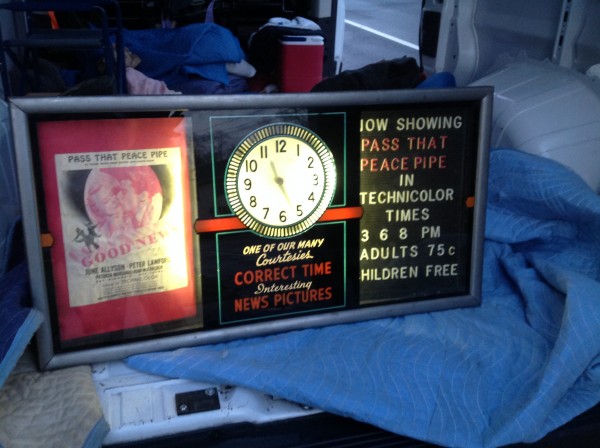 Vintage movie theater snack bar animated spinner advertising clock in as found working condition. Can’t beat condition with minor metal polishing needed. Clock not neon but back lit by florescent bulbs. Don’t pass this ony by…………….