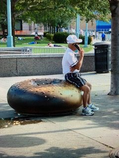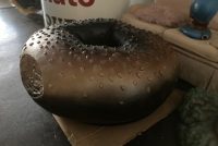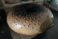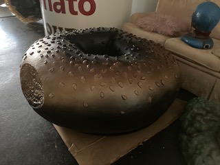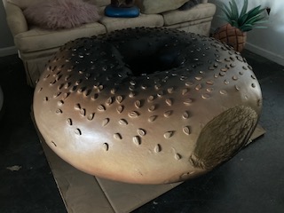 Swedish artist Hanna Liden’s “Everything” Larger Than Life Bagel NYC sculpture Bench in as found condition. Liden arrived in NYC in 1998 and began exhibiting Larger Than Life Bagel sculptures throughout the city for many years. Read more about her artistic talents on GOOGLE. Bench is well made, heavy and can be used outdoors. Measuring in at 58″ round x 22″ tall, just may be the only example remaining. Rare opportunity a great piece of NYC art………….