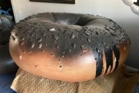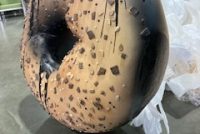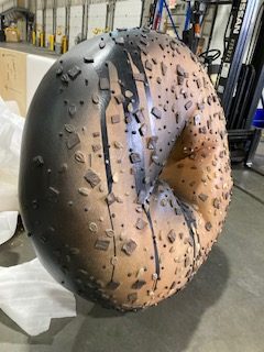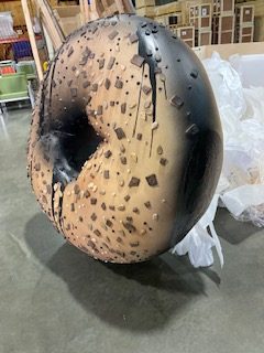 Swedish artist Hanna Linden’s Everything” Larger ThanĀ Life Stack Of Bagels NYC sculpture in as found condition. When Linden arrived in New York City in 1998 she had her first taste of a much beloved New York staple, the bagel. She exhibited sets of sculptural bagels in unexpected places around the city, giving new meaning to what Linden refers to as “a great icon of urban living”. Very talented artist with plenty to say, so GOOGLE her for more information. Sculpture is well made, heavy and made for the outdoors. Rare opportunity to own such a piece of art. Perhaps the only one example remaining from the exhibit. Must be assembled……….