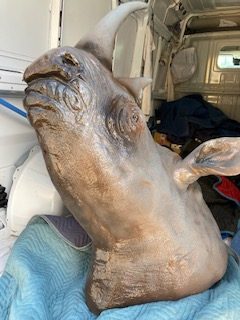 Old school fiberglass amusement park Rhinoceros mount in as found condition. Nicely done, heavy and measuring 28″ long x 19″ wide x 16″ tall. From the Lou Nasti collection, a well know animated store display artist from Brooklyn, NY. Google his name to see some of his amazing work…….