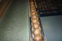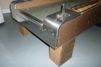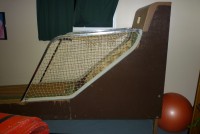 1950’s Penny arcade skee ball machine from the Atlantic City boardwalk. Original wooden balls with flip scoring. When assembled, the unit will work well. Priced accordingly, since one metal side cover is missing. Should be easy to replace……………