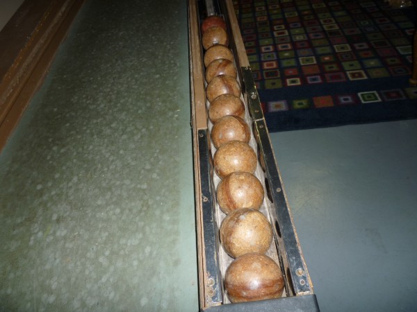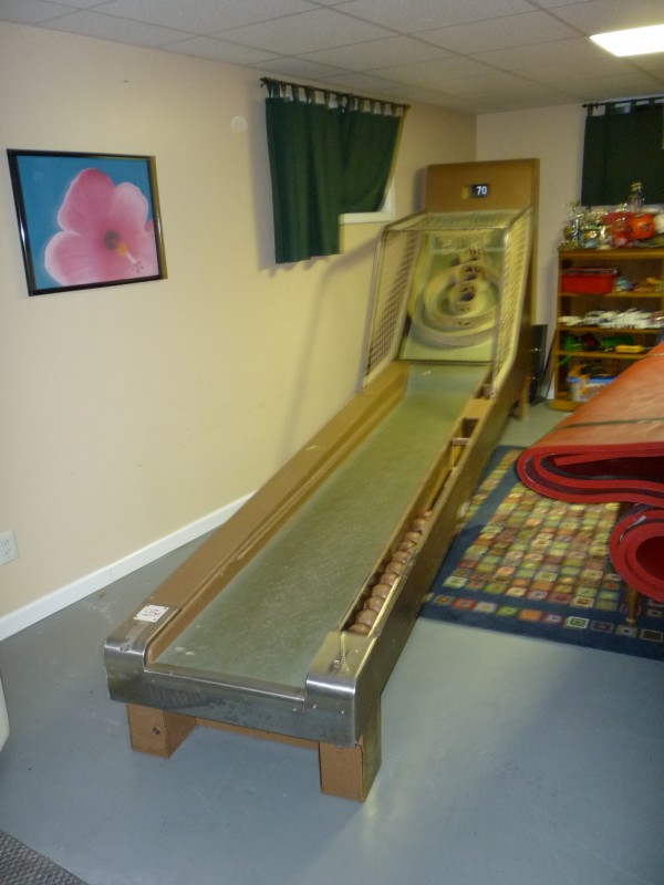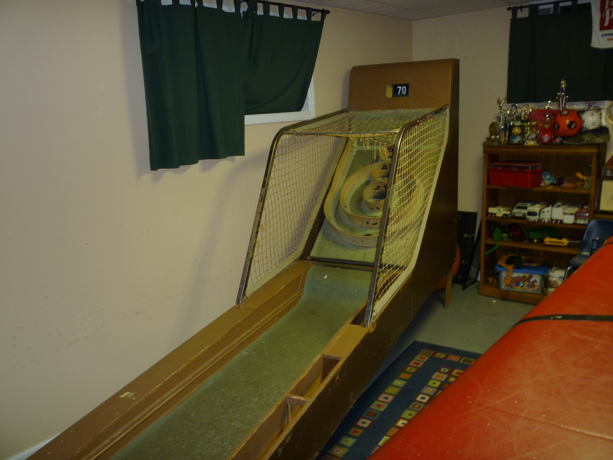 1950’s Penny arcade skee ball machine from the Atlantic City boardwalk. Original wooden balls with flip scoring. When assembled, the unit will work well. Priced accordingly, since one metal side cover is missing. Should be easy to replace……………