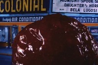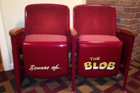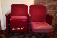 A pair of fully restored original theater seats from the Colonial Theater in Phonexville, PA. This is the town and theater where the Sci-Fi Classic “The Blob” starring Steve McQueen was filmed. Several of the movie scenes were filmed inside the Colonial including the famous “running out” scene where the Blob attacks the projectionist and then the theater patrons. These were two of the original seats removed from the theater when it was renovated. The left seat is the aisle seat so it features ornate embossed metalwork on the side panel. The two seats link together to form a pair. Documented history, these seats were purchased directly from historian Vincent Martino Jr. author of the book Phonenixville – Then & Now .