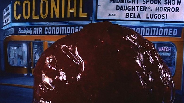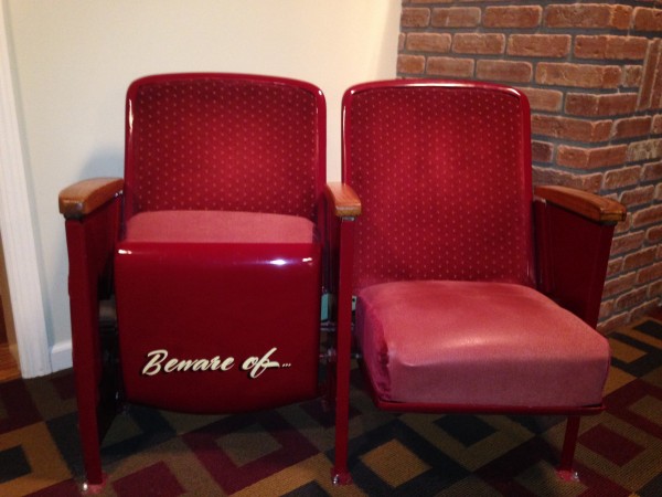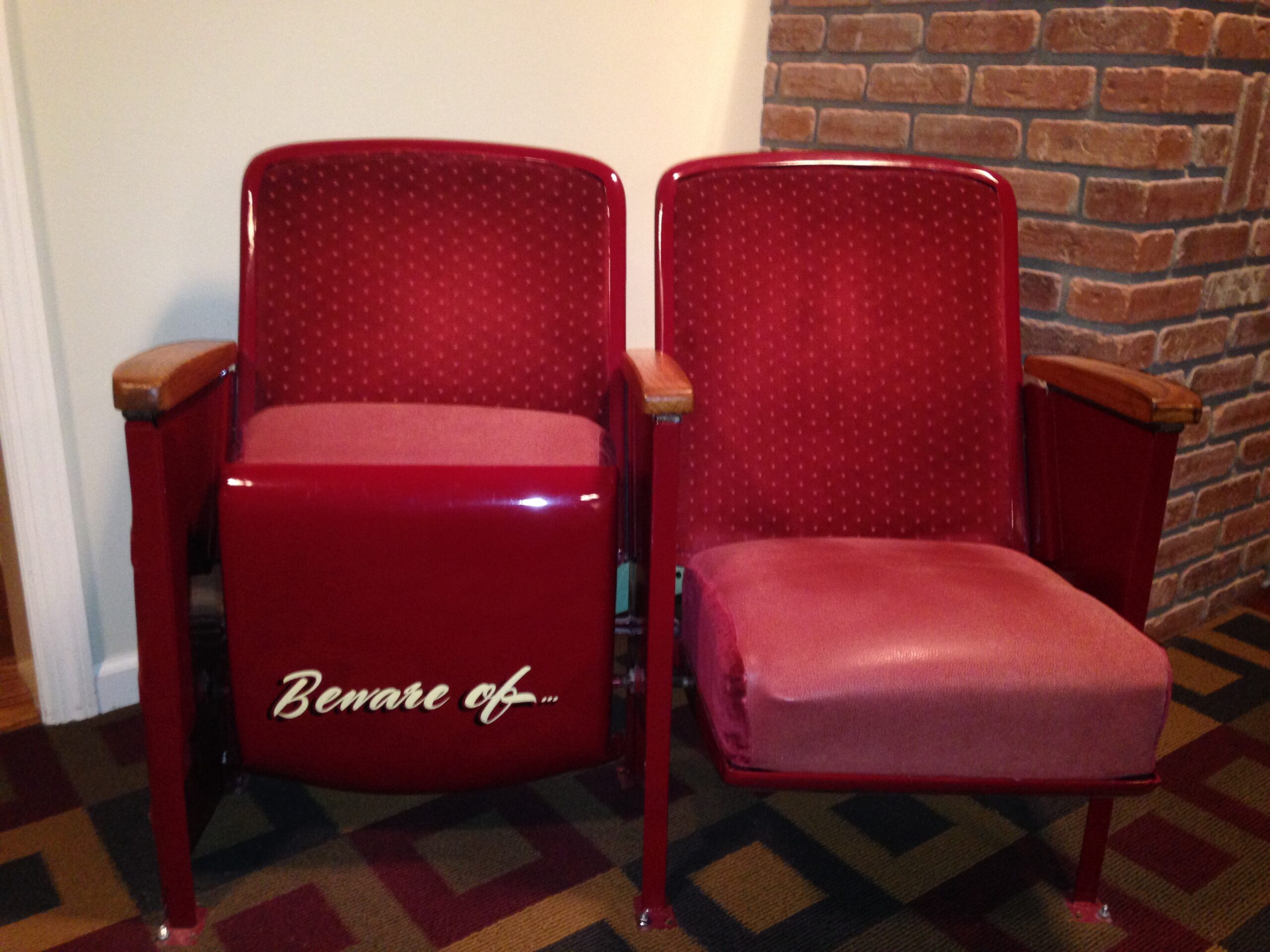 A pair of fully restored original theater seats from the Colonial Theater in Phonexville, PA. This is the town and theater where the Sci-Fi Classic “The Blob” starring Steve McQueen was filmed. Several of the movie scenes were filmed inside the Colonial including the famous “running out” scene where the Blob attacks the projectionist and then the theater patrons. These were two of the original seats removed from the theater when it was renovated. The left seat is the aisle seat so it features ornate embossed metalwork on the side panel. The two seats link together to form a pair. Documented history, these seats were purchased directly from historian Vincent Martino Jr. author of the book Phonenixville – Then & Now .