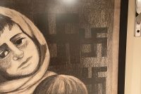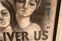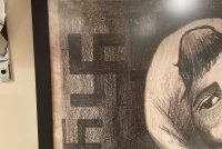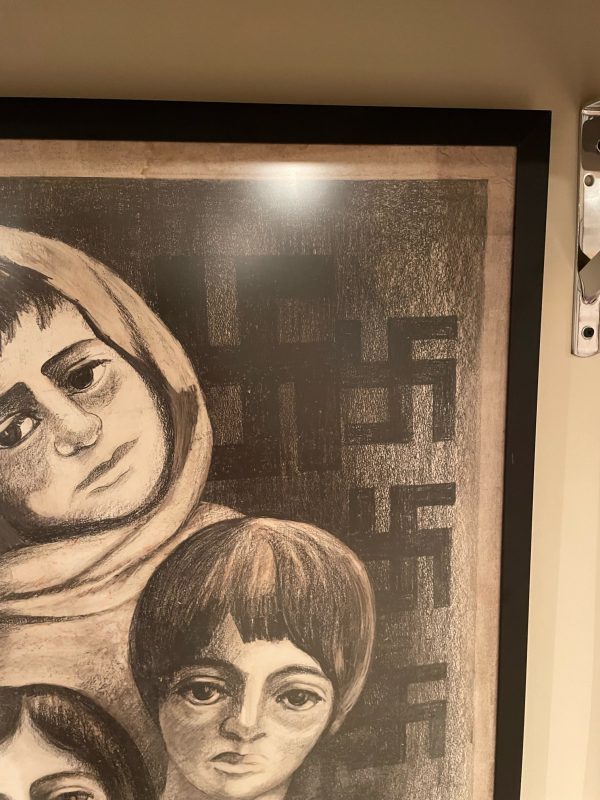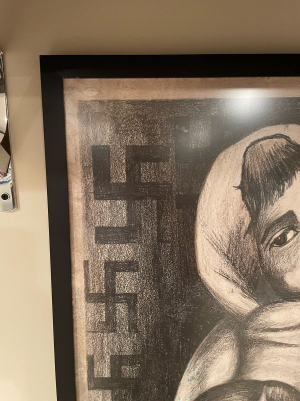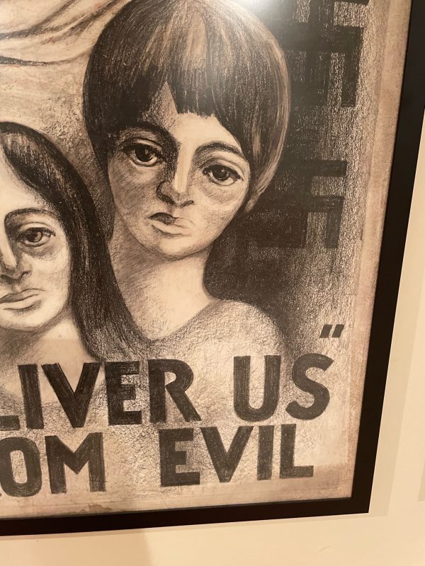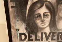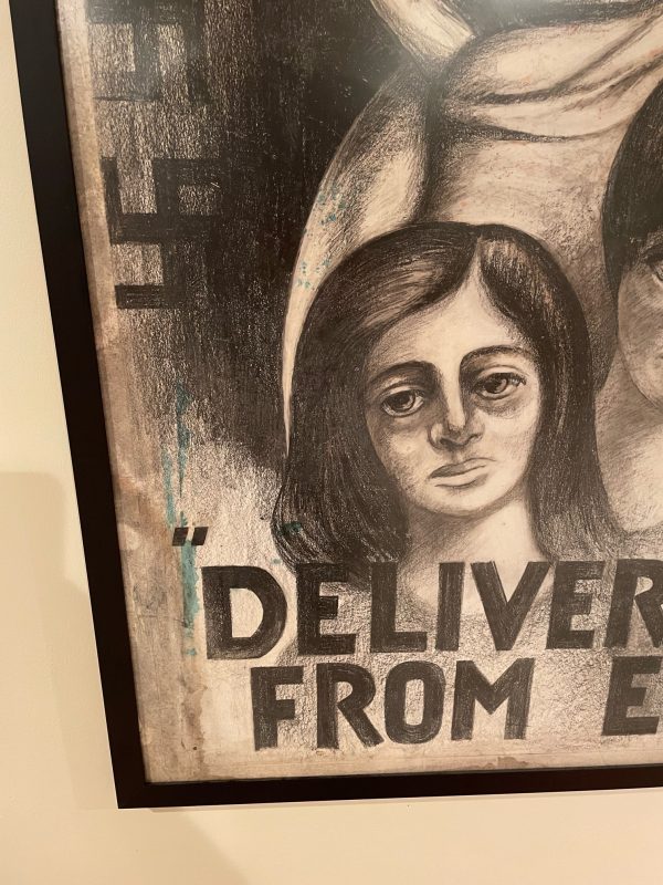 One of a kind historic item from the National War Poster Competition held by the Museum Of Modern Art, 1942. The purpose of this competition was to have posters created to boost morale for the war. Artists were asked to choose between 8 themes. Production, War Bonds, The Nature Of The Enemy, Loose Talk, Slave World Or Free World, The People Are On The March, Deliver Us From Evil, and Sacrifice. Only 9 winners were chosen, and this example, not one of the winners, was never printed into a poster. They were judged anonymously. Other than the 9 winners of the competition, all art works were discarded by the MOMA in the 1980s. Only 6 of these art works are still known to exist, this is one of them. Charcoal on artistry board. Measures 27.5×35.5” in the frame.