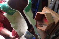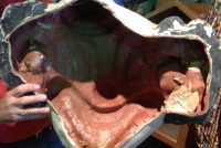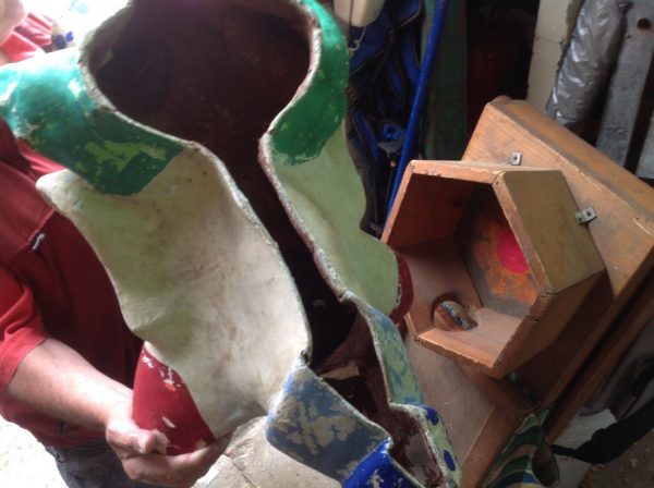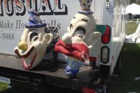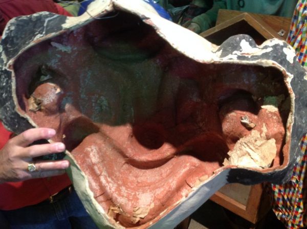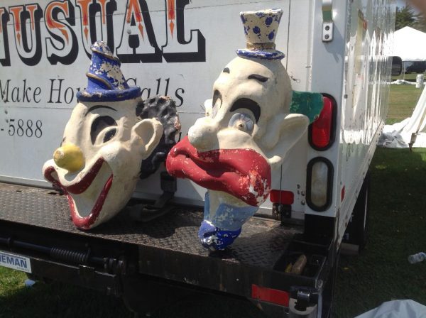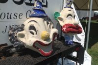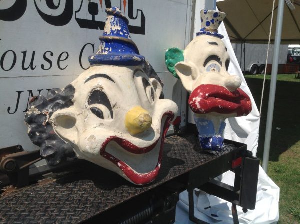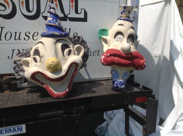 Pair of paper mache amusement park clown heads in as found condition. Clown to the left is 26″ x 25″ x 13″, clown to the right