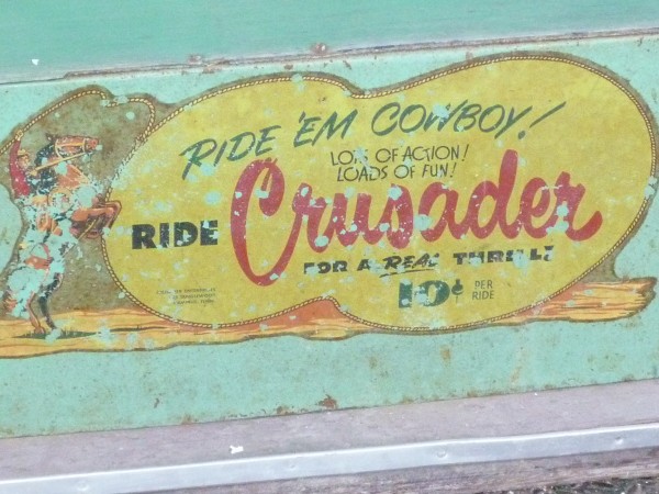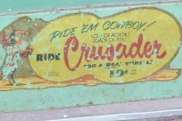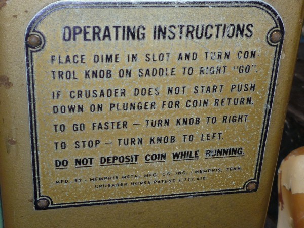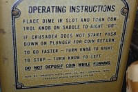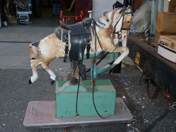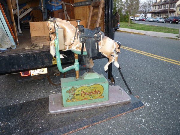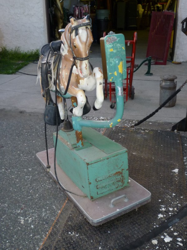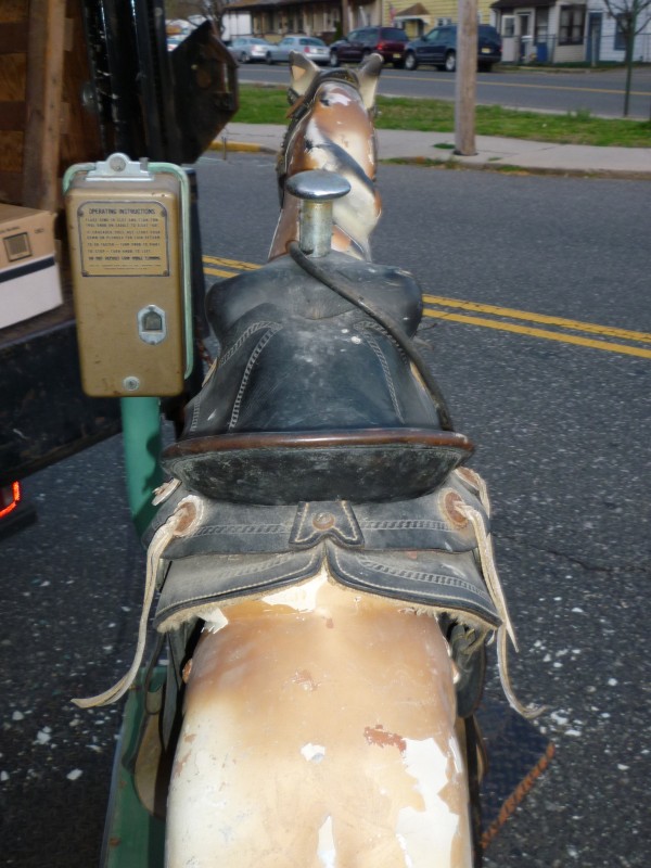 Rare coin operated Crusader horse in as found condition. Came from a Lancaster County,Pa farm barn that has been closed since the 1970’s. Paint is peeling and the saddle may not be original to the horse but otherwise in nice condition. Restoration will be necessary to bring her back to original condition. Easy summer project……..