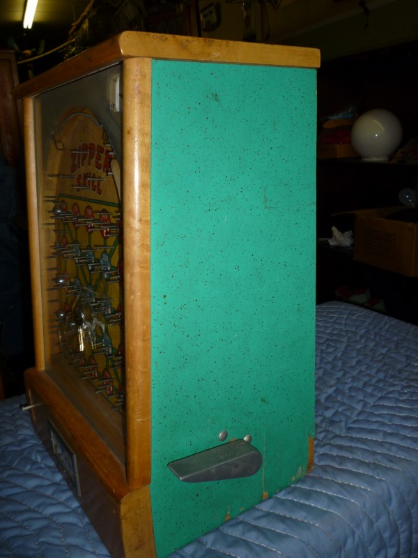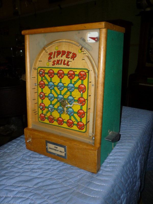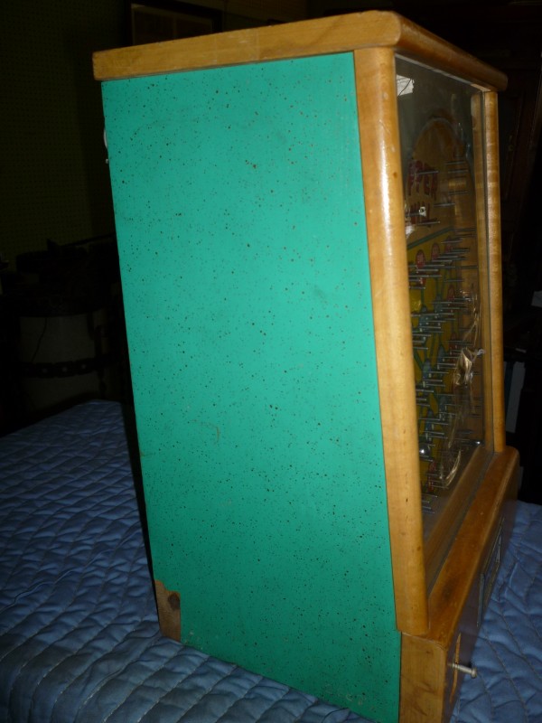 This coin-operated trade stimulator skill game, was mfgd by M.T. Sales-Chicago.Nice wood case w/glass face.