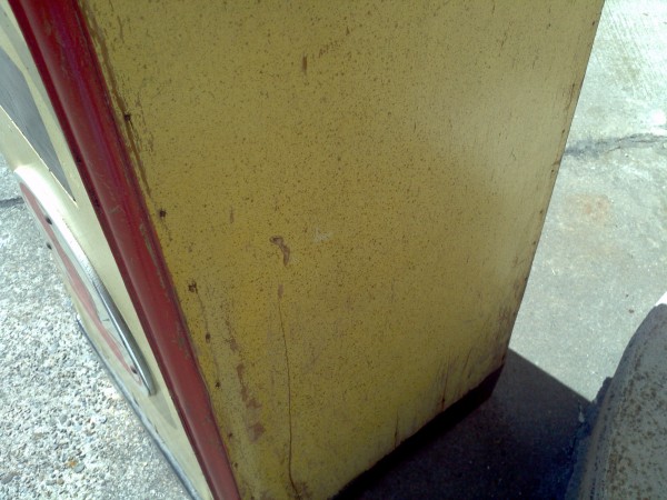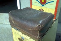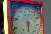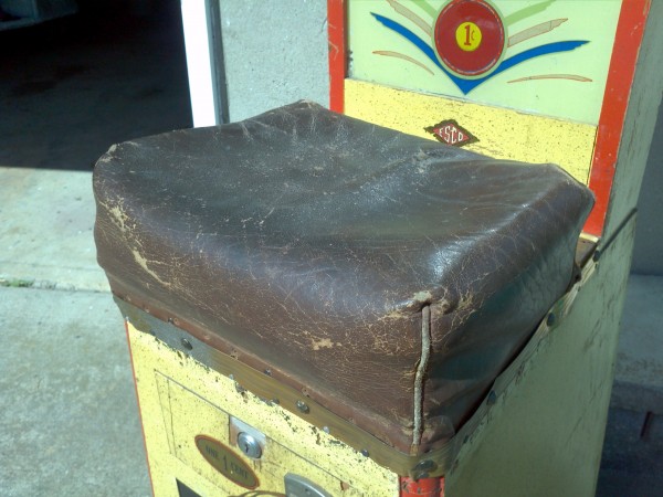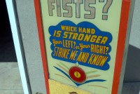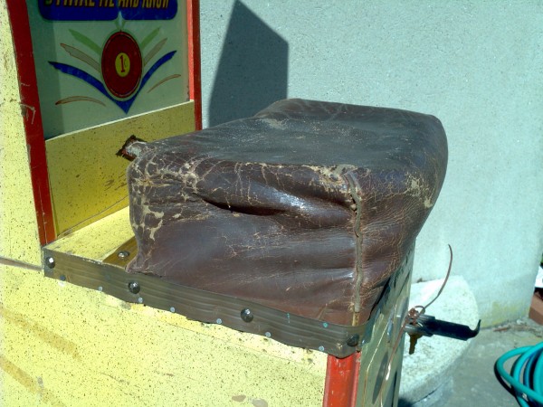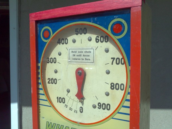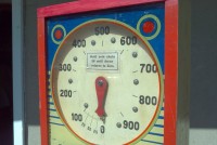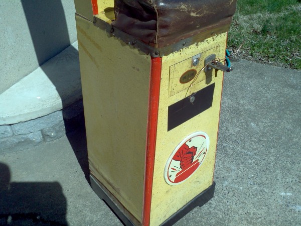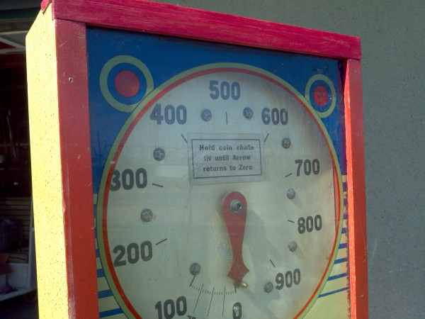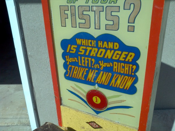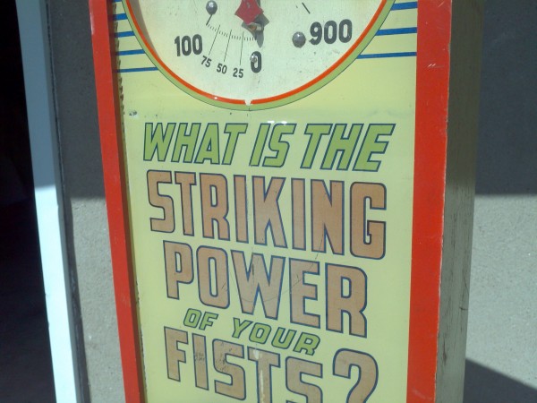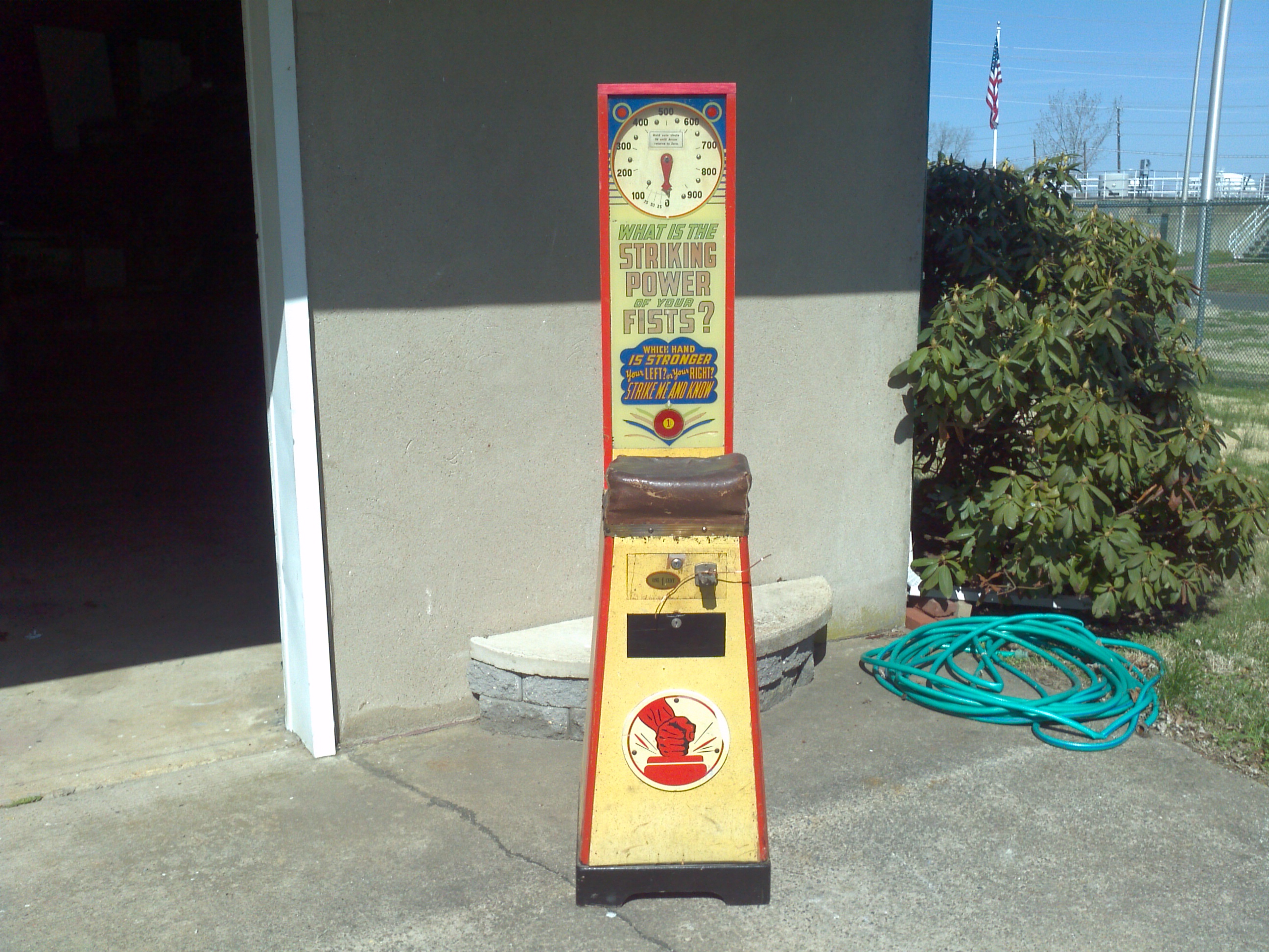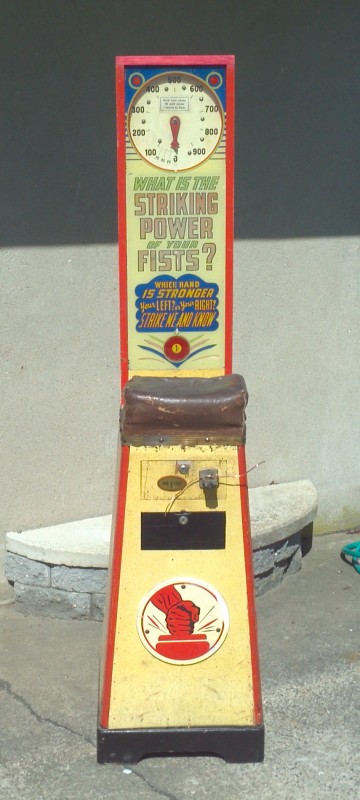 Vintage old penny arcade fist strenght tester in working condition. Will need some minor adjustments and restoration. Insert penny, hit mat and register your score. Hard to find coin operated game………
