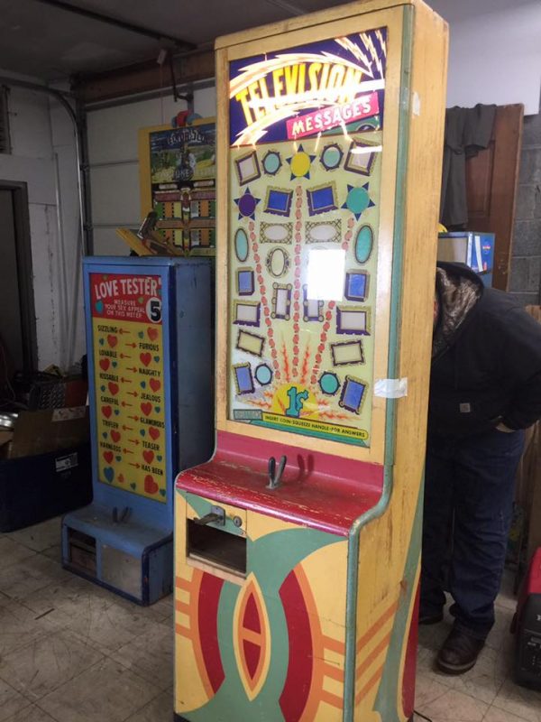 Vintage penny arcade television message meter in as found condition. Works but will need servicing to work correctly. Backglass showing signs of fading and slight peeling and part of the coin entry door is missing but otherwise a complete looking machine. Nice arcade addition……………..