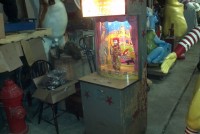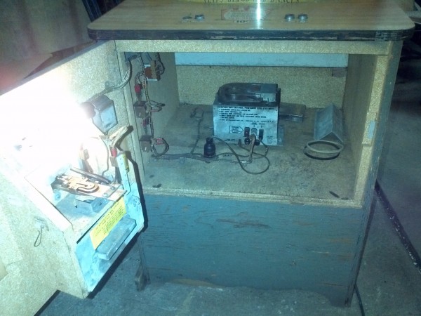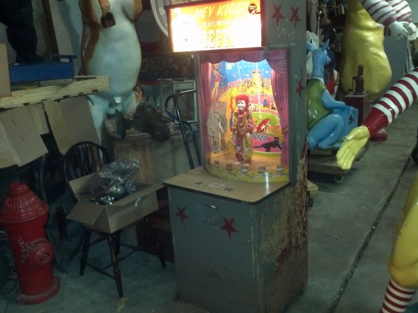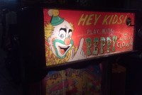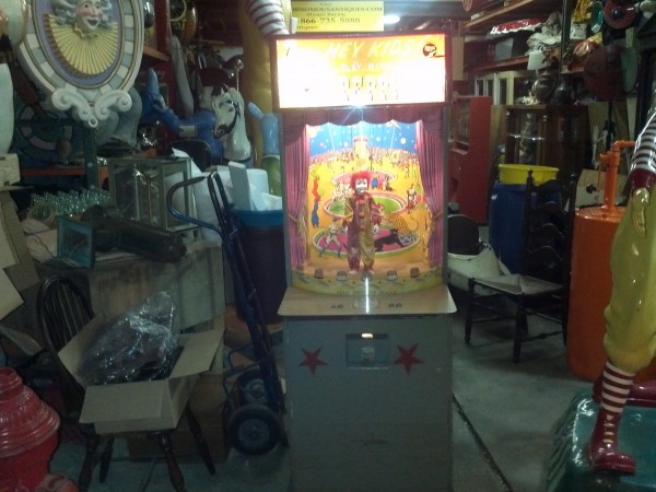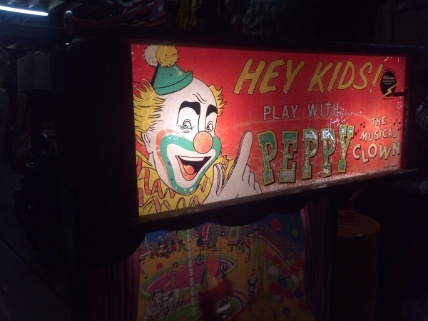 1956 Peppy The Clown arcade machine in as found condition. Looks complete with original tape deck and tape. Will need to be serviced and minor cabinet restoration done. Just found in an old deli in Philadelphia after being closed for many years. Hums when plugged in. Some backglass peeling. Easy restoration project for the right person…….