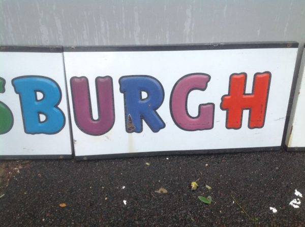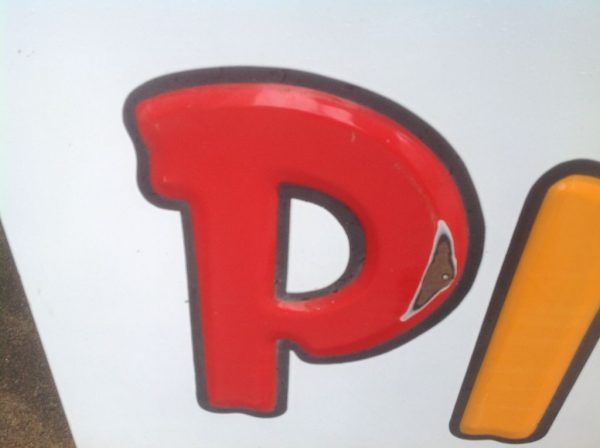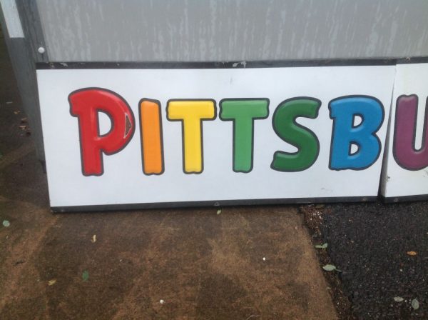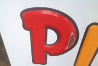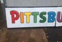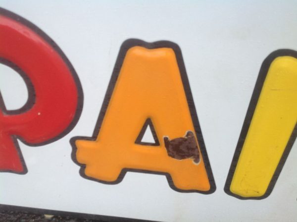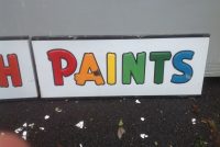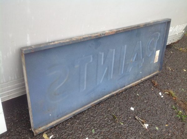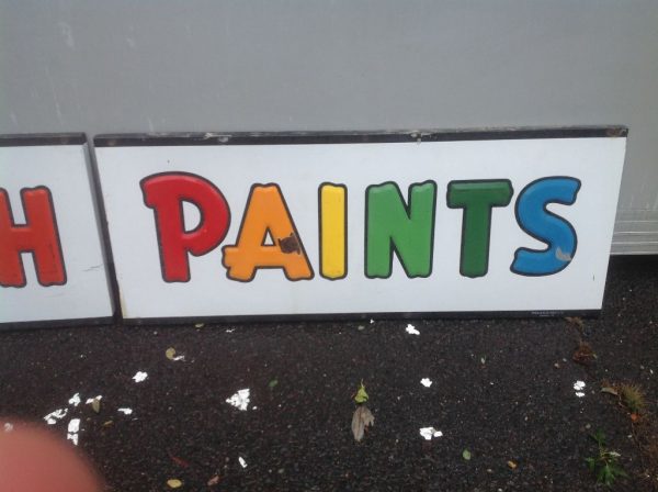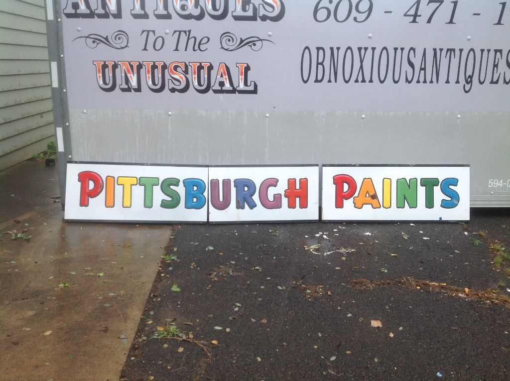 Vintage porcelain Pittsburgh paints store sign in as found condition. Sign measures almost 13′ long with bright colors Nice overall shape with a few minor dings………….