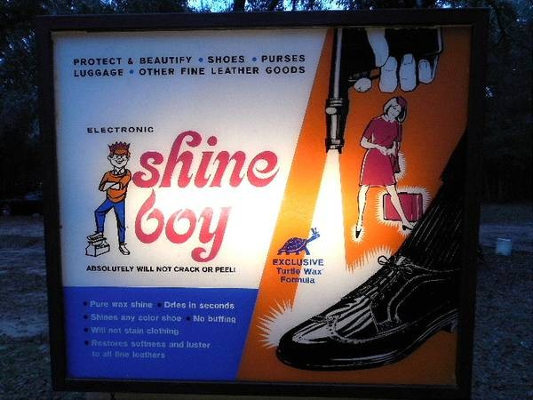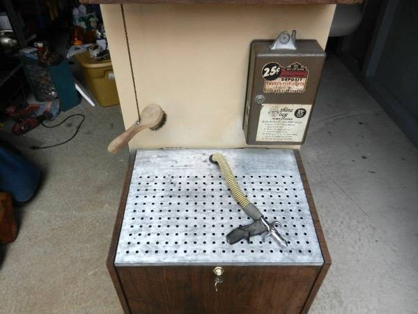 Rare coin operated Shine Boy vending machine in as found condition. Looks to be complete with keys. Nice graphics. Has not been tested but the principal operating instructions are deposit coin, spray on shine liquid and buff. Some liquid is included but looks to be old. Neat old piece of coin op………….