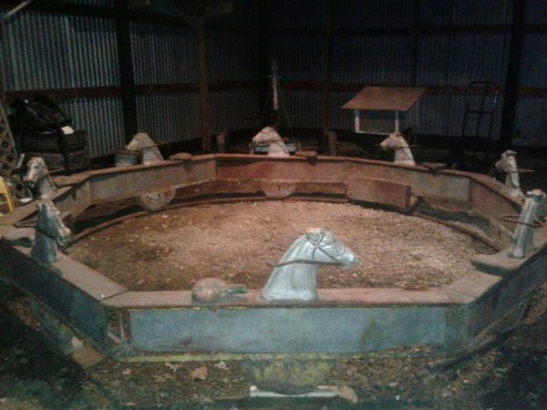 Rare antique campground amusement park carousel in as found condition. Ride will need to be restored. All cast iron horses are attached but frame will need sheet metal work as well as 2  motors replaced to repaired. Ride runs on 1 1/2″ steel tubing track but not sure exactly how its powered. Rare find. A good restoration specialist can bring this beauty back to life. May be “one of a kind”. In my 47 years of business, I have never seen another………