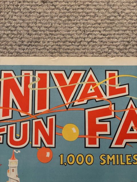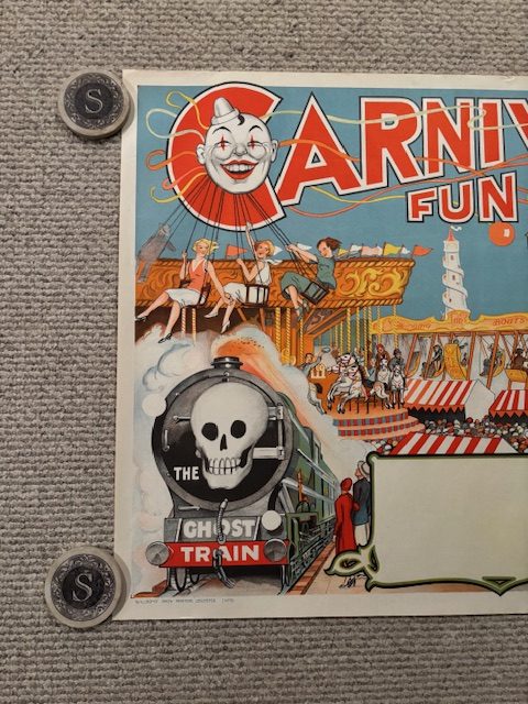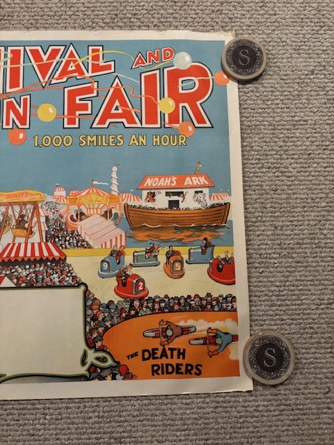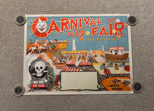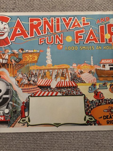 This rare Fun Fair and Carnival poster from Willsons of Leicester was printed in the 1930s. The blank white section would be where dates, times and location would be stamped. Featuring The Death Riders, Ghost Train and Noah’s Ark among other rides.