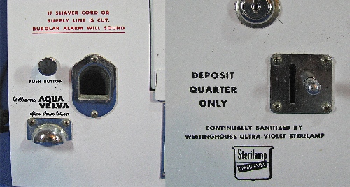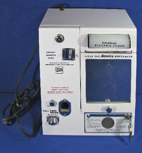 Wall mounted 1940’s electric shaver in what looks to be “never used” condition. Manufactured by Mountain Airs, Inc. These are almost never found in this condition. A real conversation piece. A must for any coin op collector………………