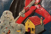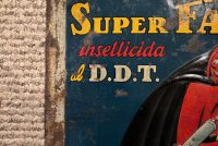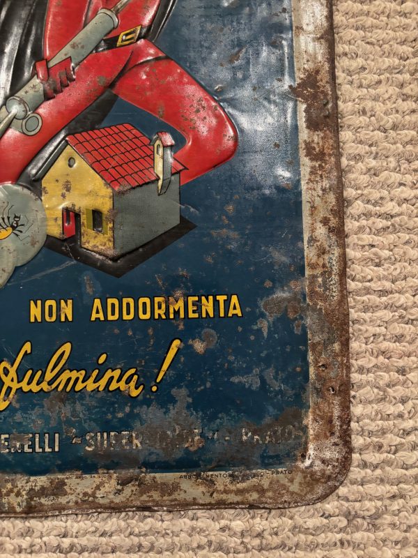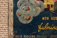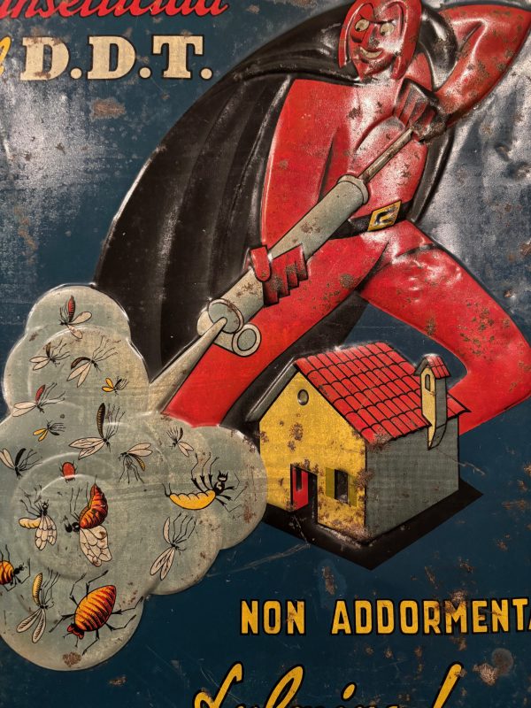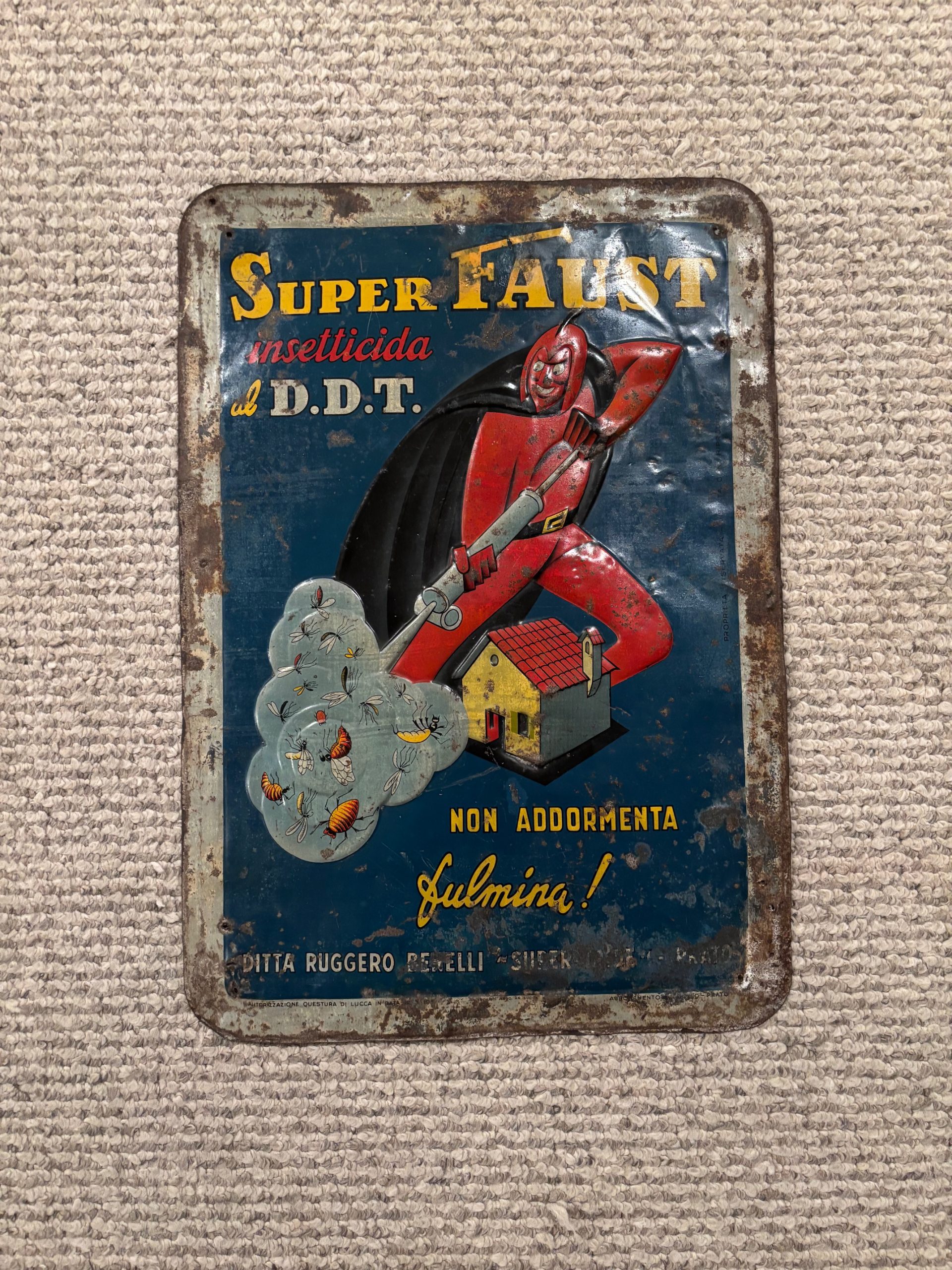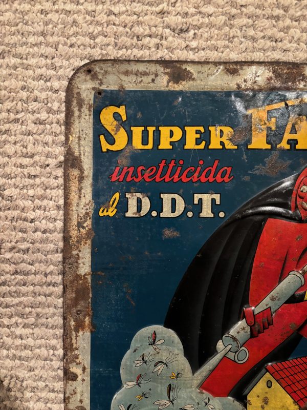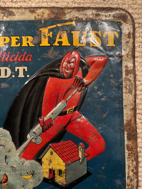 Super Faust Italian Insecticide / DDT Tin Sign in found condition. Phenomenal graphics on this heavily embossed sign with lots of color. Good overall condition with a small bit of restoration in the F of Faust as shown. We cannot locate a single other example of this sign. First we have ever seen.