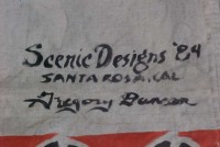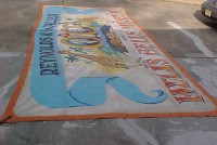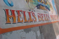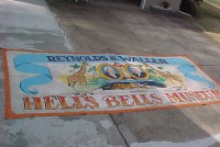 This large banner used to hang over the entrance way to the Hells Bells Museum. Bright colors. Measures 102″ tall x 19 1/2′ long. Signed and dated. What a wonderful piece of americana………..