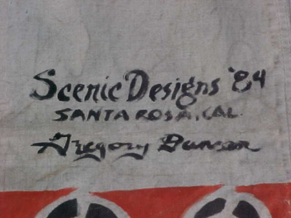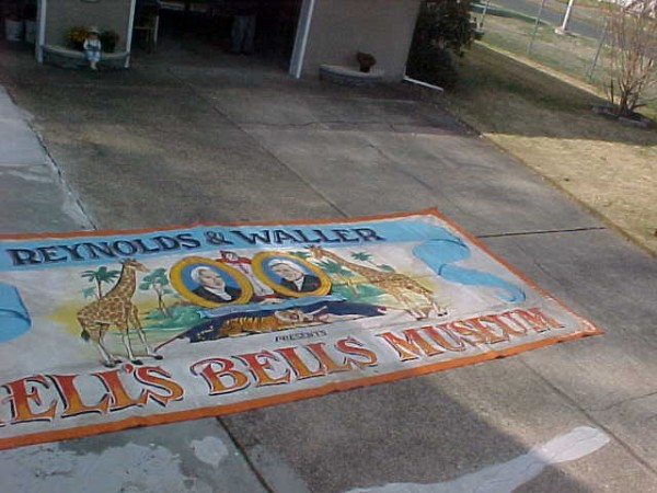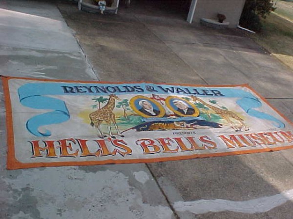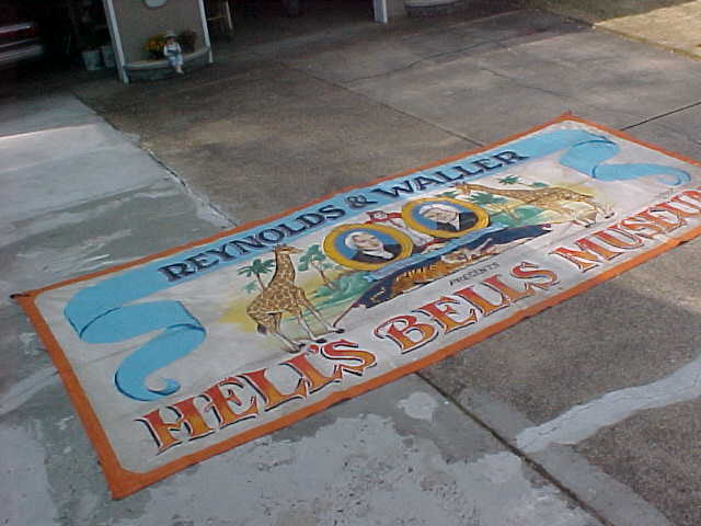 This large banner used to hang over the entrance way to the Hells Bells Museum. Bright colors. Measures 102″ tall x 19 1/2′ long. Signed and dated. What a wonderful piece of americana………..